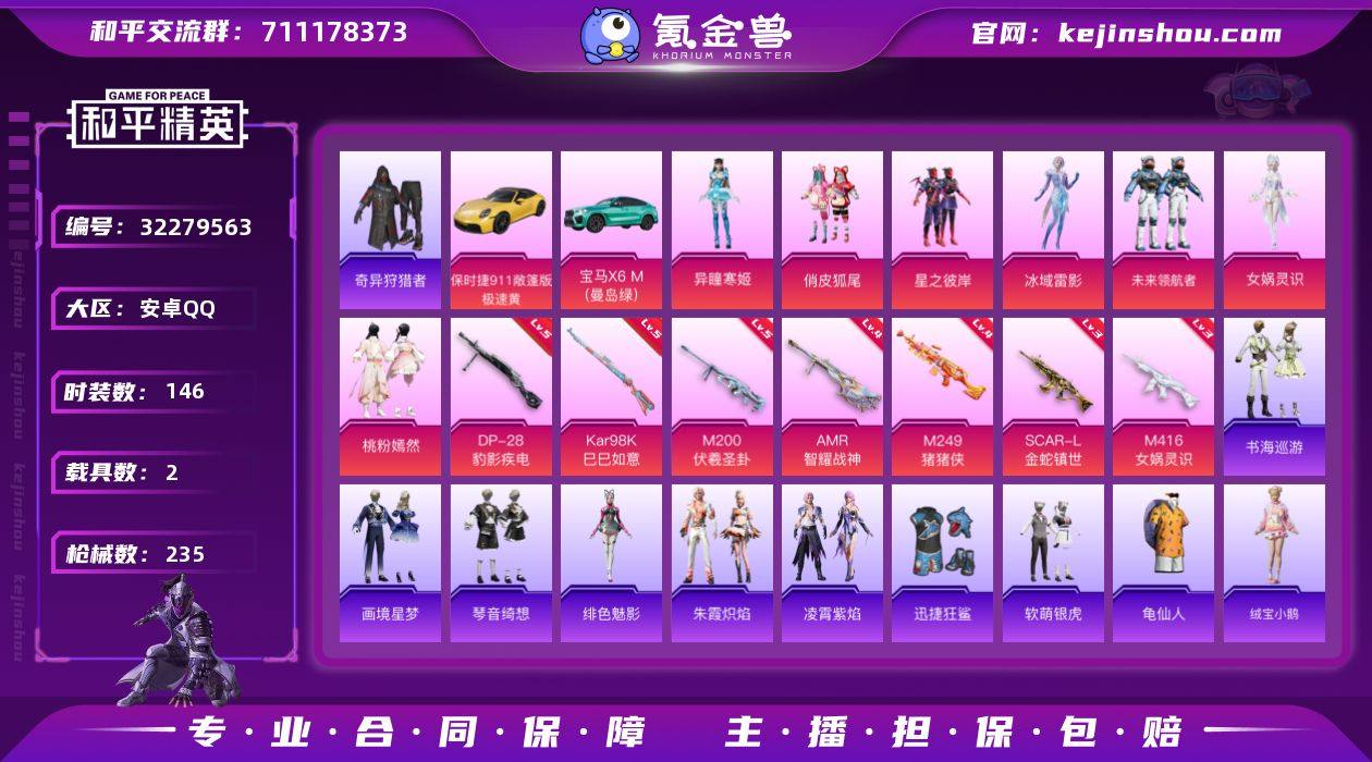 【930526】安卓 【男神号 奇异狩猎者/龟仙人/女娲灵识/SCAR-L-金蛇镇世(三级)/M416-女娲灵识(三级)/宝马X6 M(曼岛绿/保时捷911 敞篷版(极速黄)】手Q-7粉装-10特效枪-2载具-3粉色飞行器-73340热力值-6王牌印记-146套装-235枪皮 【热门品类】:套装-奇异狩猎者,套装-龟仙人 【粉色套装】:粉装-俏皮狐尾,粉装-星之彼岸,角色-冰域雷影,粉装-未来领航者,角色-女娲灵识,粉装-桃粉嫣然,角色-异瞳寒姬 【粉色枪皮等级】:SCAR-L-金蛇镇世(三级),M416-女娲灵识(三级),AKS-74U-森灵之息(五级),Kar98K-巳巳如意(五级),AMR-智耀战神(四级),M200-伏羲圣卦(五级),M249-猪猪侠(四级),DP-28-豹影疾电(五级) 【粉色载具】:宝马X6 M(曼岛绿),保时捷911 敞篷版(极速黄) 【粉色枪皮】:SCAR-L-金蛇镇世,M416-女娲灵识,AKS-74U-森灵之息,Kar98K-巳巳如意,Mk14-福马献瑞,AMR-智耀战神,M200-伏羲圣卦,M249-猪猪侠,DP-28-豹影疾电 【粉色飞行器】:炫彩糖果飞行器,BEARBRICK飞行器,万象金身飞行器 【粉色降落伞】:春暖花开降落伞,华贵君王降落伞,阿狸红降落伞,蓝莓炮弹降落伞,飒粉甜心降落伞,天星战神降落伞,炎氏战神降落伞,未来歌姬降落伞,粉樱探戈降落伞...