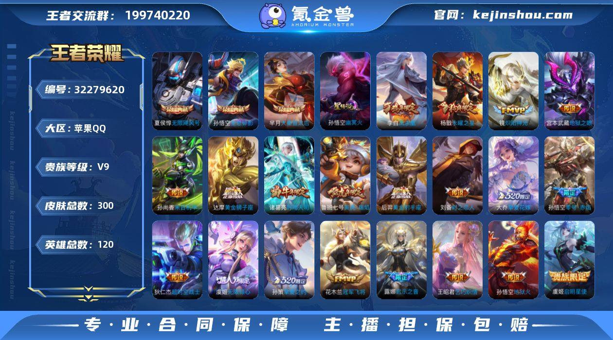 V9 3典藏 21传说 1星元 300皮肤 120英雄 【3水晶】芈月-大秦宣太后,孙悟空-全息碎影,夏侯惇-无限飓风号【21传说】虞姬-无限倾心,后羿-无尽星芒,大乔-挚爱花嫁,孙策-挚爱之约,达摩-黄金狮子座,狄仁杰-超时空战士,宫本武藏-地狱之眼,后羿-黄金射手座,花木兰-冠军飞将,镜-炽阳神光,李白-凤求凰,刘备-时之恋人,鲁班七号-寅虎·瑞焰,孙尚香-末日机甲,孙悟空-地狱火,孙悟空-零号·赤焰,王昭君-乞巧织情,杨戬-永曜之星,虞姬-启明星使,诸葛亮-时雨天司,露娜-启示之音【1星元】孙悟空-幽冥火【77史诗】元歌-无心,鬼谷子-五谷丰年,赵云-未来纪元,艾琳-奇遇舞章,明世隐-吟游魔法,安琪拉-心灵骇客,白起-星夜王子,百里守约-特工魅影,百里玄策-原初追逐者,蔡文姬-舞动绿茵,曹操-幽灵船长,曹操-天狼征服者,蔡文姬-繁星吟游,程咬金-功夫厨神,妲己-女仆咖啡,妲己-魅力维加斯,狄仁杰-魔术师,狄仁杰-鹰眼统帅,典韦-蓝屏警告,貂蝉-圣诞恋歌,东皇太一-逐梦之光,干将莫邪-真爱魔法,宫本武藏-鬼剑武藏,韩信-白龙吟,韩信-逐梦之影,韩信-飞衡,韩信-傲雪梅枪,后羿-辉光之辰,后羿-如梦令,花木兰-水晶猎龙者,橘右京-修罗,黄忠-火炮绅士,兰陵王-暗隐猎兽者,兰陵王-驯魔猎人,李白-千年之狐,李元芳-逐浪之夏,李...