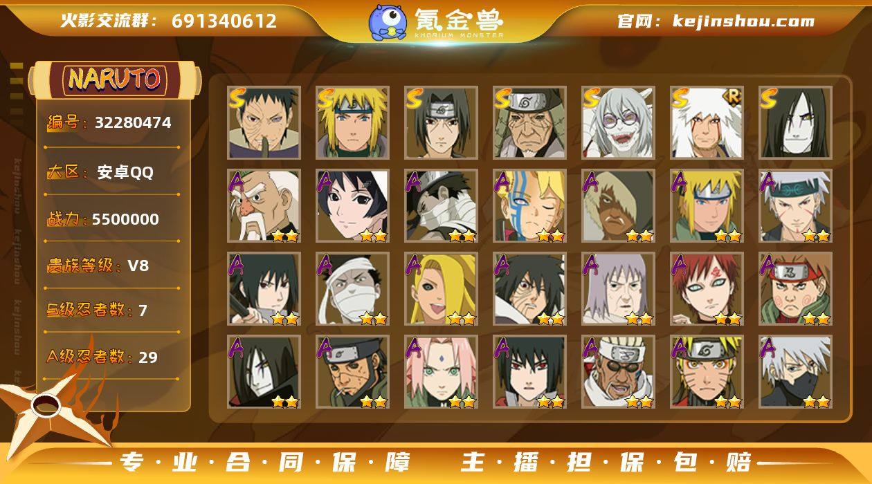 实名: 可修改 贵族等级: V8 S忍数: 7 A忍数: 29 战力值(万): 550 S级忍者: 药师兜「仙人模式」,猿飞日斩「秽土转生」,大蛇丸,波风水门,宇智波鼬 「须佐能乎」,宇智波带土 「忍界大战」,自来也 「舞之豪杰」
