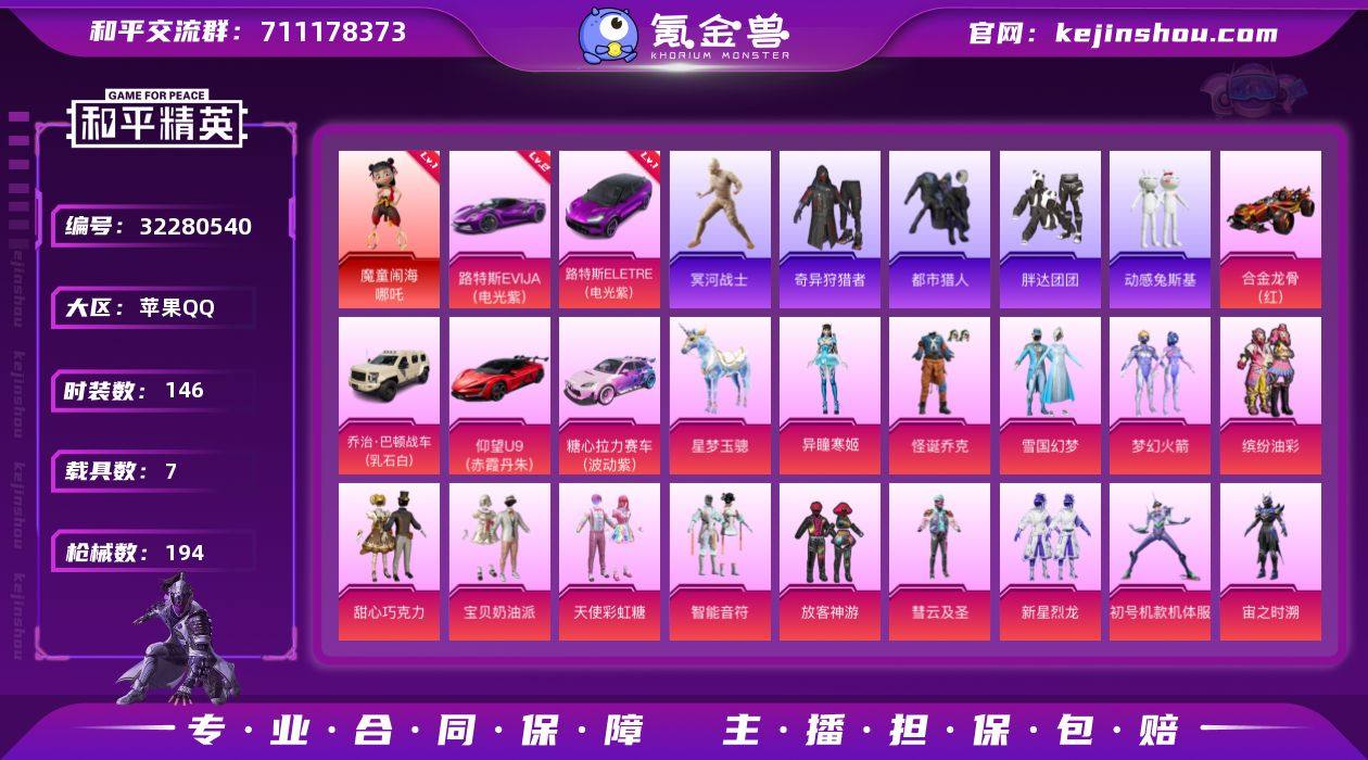 【930818】【正版单ID狼苹果Q-1神装-24粉装-24特效枪-7载具】苹果Q-1神装-24粉装-24特效枪-7载具-8粉色飞行器-98368热力值-12王牌印记-146套装-194枪皮 【红色载具】:路特斯ELETRE(电光紫)(一级),路特斯EVIJA(电光紫)(二级) 【红色神装等级】:魔童闹海-哪吒(一级) 【红色角色神装】:魔童闹海-哪吒 【热门品类】:粉装-怪诞乔克,粉装-雪国幻梦,粉装-梦幻火箭,粉装-缤纷油彩,套装-浪漫天命,套装-都市猎人,套装-冥河战士,套装-奇异狩猎者,套装-胖达团团,套装-动感兔斯基人偶服,套装-龟仙人,套装-暗影哥特 【粉色套装】:粉装-怪诞乔克,粉装-甜心巧克力,粉装-宝贝奶油派,粉装-天使彩虹糖,粉装-雪国幻梦,粉装-梦幻火箭,粉装-智能音符,粉装-缤纷油彩,粉装-放客神游,粉装-彗云及圣,粉装-新星烈龙,角色-初号机款机体服,角色-宙之时溯,角色-星云暗核,角色-圣堂之誓,粉装-霓虹漫游,角色-脉冲星,角色-超弦星,角色-电磁星,角色-引力星,角色-光极星,角色-电波星,角色-星梦奇缘,角色-异瞳寒姬 【粉色枪皮等级】:AKM-甜心宝贝(三级),AKM-梦之光华(一级),AKM-星际浪客(一级),AKM-盖世英雄(一级),SCAR-L-梦幻火箭(一级),SCAR-L-天蓬元帅(四级)...