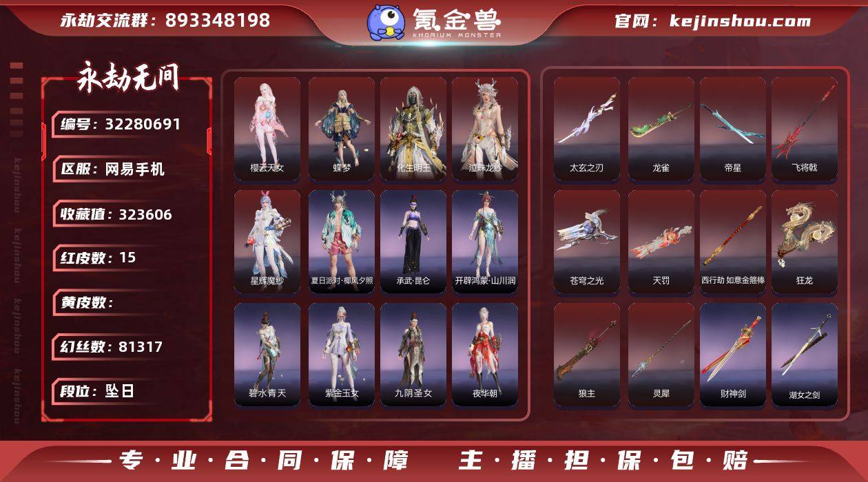 红皮数: 7 金皮数量: 234 英雄外观数: 827 武器外观数: 202 幻丝数: 73584 等级: 270 版本: 终极版 红皮: 初代玄女(宁红叶皮肤),沙漠香风(迦南皮肤),熛怒炼火(季沧海皮肤),狼主(阔刀皮肤),凤求凰(双刀皮肤),少阳剑(长剑皮肤),画中仙(蓝梦皮肤) 宁红夜金皮: 九阴圣女,玄豹姿,西行劫·蜘蛛精,耀世魂花 迦南金皮: 瀚海苍鹰,神鹰之女,观山海·青鸟 季沧海金皮: 立天地,游四海,瑞火麟,龙心炽焰,巫师3·杰洛特 胡桃金皮: 御宅罗梦(白丝),清雅少女,贵胄少女 天海金皮: 八宝龙王,若水尊者 崔三娘金皮: 赤雾烟霞,巨鲸客 岳山金皮: 常胜袍,西行劫·杨戬 无尘金皮: 未济袍,朝闻道,灵鹿巫者,幽篁山鬼 顾清寒金皮: 赤丹朱湛,藏雨阁主 殷紫萍金皮: 沐昭 沈妙金皮: 絮云衣,西行劫·紫衣仙子 胡为金皮: 行空裘,观山海·秋神蓐收 季莹莹金皮: 观山海·冬神玄冥,夏日派对·盛夏白阳 席拉金皮: 开辟鸿蒙·日月明 飞索金皮: 铁护臂 长剑金皮: 侠骨·清光引,巫师3·湖女之剑 太刀金皮: 樱华,劫烬·燎,金玉一文字 阔刀金皮: 山君怒,龙蟠 斩马刀金皮: 劫涛·潮 长枪金皮: 建木,长虹,焦钰,劫垢·堀,观山海·金神钺,灵木角 棍金皮: 戒律杖,倒马棍,学宫之杖 匕首金皮: 残霄,华夏神兵·马首刀,仙舞,三更令,夏日派对·西瓜棒冰 双节棍金皮: 精武,镇魔杵,法持,除岁,嘶风 双刀金皮: 破重云,天之刑,天威,无救 双戟金皮: 观山海·水衡 横刀金皮: 雷厉 拳刃金皮: 无相印 弓箭金皮: 腥红之月,春水,青花,风驰弓,乌木弓 远程金皮: 朱雀(连弩),心魔(五眼铳),梦魇(五眼铳),竹霹雳(火炮),墨不归(火炮),鹦鹉螺(五眼铳),雨歇(连弩),观山海·嘉果花(火炮),千机弩(连弩),虎踞(五眼铳),镇海(连弩) 饰品金皮: 雾隐繁花(宁红夜面部),金羽六角铃(迦南右后腰),福虎帽(胡桃头部),纸人·姑获鸟(妖刀姬左前腰),炎流云禅笠(天海头部),上侍帽(武田信忠头部),华夏宝甲·归正(岳山头部),夕暮面(武田信忠面部),瑞火壶(季沧海左后腰),【3.26可二次换绑、期间可登录网易大神正常玩游戏】