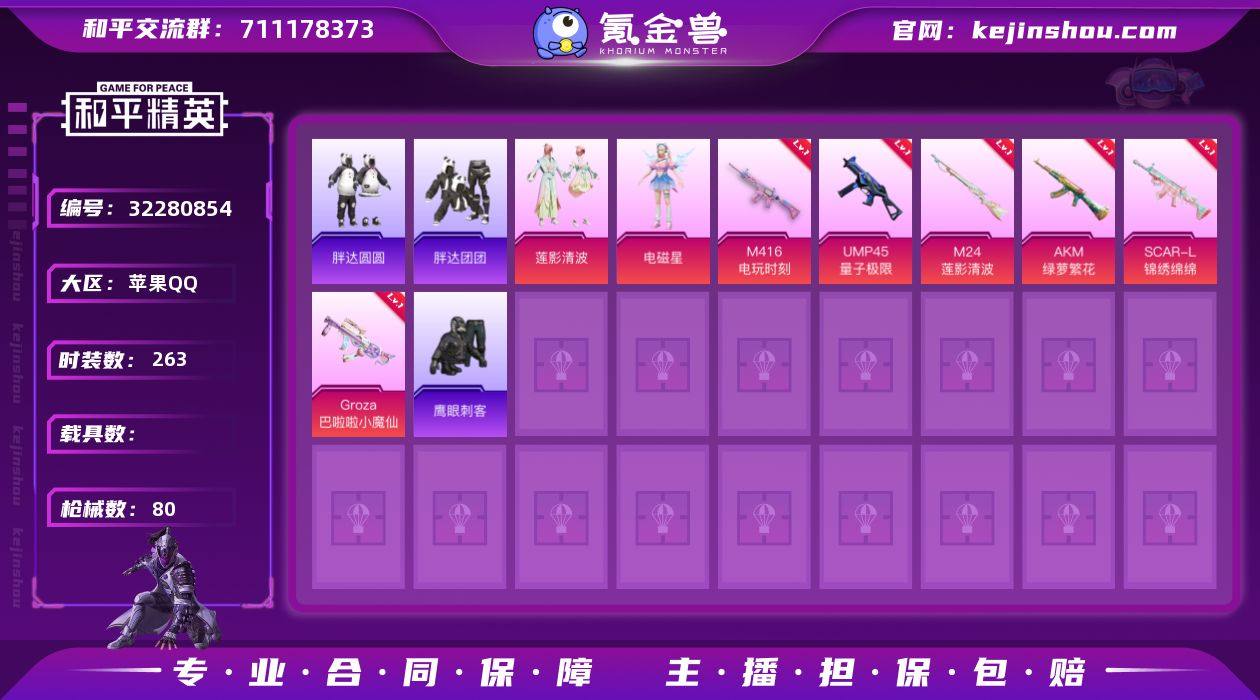 3粉装 7特效枪 5印记 可二次 身法装备:8号机(新粉螳螂),Mark.06(新蓝螳螂) 热门装扮:莲影清波,美琪,电磁星,胖达圆圆,胖达团团,鹰眼刺客 稀有枪皮:Kar98K-巳巳如意,UMP45量子极限,M416电玩时刻,M24莲影清波,AKM绿萝繁花,SCAR-L-锦绣绵绵,Groza巴啦啦小魔仙 五级特效枪:五级UMP45-量子极限,五级SCAR-L-锦绣绵绵,五级GROZA-巴啦啦小魔仙,五级M416-电玩时刻,五级AKM-绿萝繁花 四级特效枪:四级Kar98K-巳巳如意,四级M24-莲影清波 紫色装扮:竞技名士,红潮炫舞,SS24特训(SS24特训套装),SS25特训,惊鸿侠骨,锦衣飞扬,卖崽青蛙,SS28特训,热情海星,纯真浪花,蝶吟花词,Mark.06(新蓝螳螂),8号机(新粉螳螂),创世·追猎,SS26特训,彩霞狙击,快闪甜心,春光漫游,晨曦薄雾,云霞荷露,无暇誓言,幻羽潜行,SS27特训,幽夜迷踪,焰鹰斗篷 优质战备:创世·救赎降落伞,巴啦啦小魔仙降落伞,极限特训降落伞,彩装战姬降落伞,莲影清波降落伞
