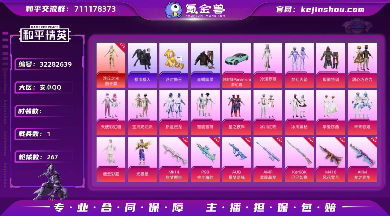 1红装 20粉装 15粉枪 5载具 1稀有装备 227套装 337枪皮 43热门 兰博轿车灰色 星梦玉骢 迈凯伦塞纳(冷萃蓝) 宝马X6 M(曼岛绿) 奇异狩猎者 沙丘之主-图卡盟 梦幻火箭 天使彩虹糖 冰霜白皇 星之彼岸 复仇流浪者 超能勇士 滨海厨神 吉莉礼服 快乐星愿 星梦畅游 幻羽潜行 虎虎生威吉莉 空投萌叽 莲影清波 炫蓝之夏 萌黄之夏 玩偶服-菲菲 黄色名流 牛气满满 猛禽 破晓战魂 鹤鸣 荣耀 隐空刺 萌趣颜团子 电音精灵 特种颜团子 飞行日记 飞狐塔尔斯 莱茵河畔 福星高照 神气柴柴 甜梦熊熊 幻彩翩翩 水晶王族 柠萌假日 王牌教练 青玉碎影 浴火魔神 飞驰魅影 龟仙人 音速流光 无暇誓言 涂山之恋 爆裂葡萄 空岛之星 贝斯之夜 贵族骑装 金戈铁马 都市漫游者 灵蜜圈圈 惊鸿侠骨 萌趣咩咩 竞技名士 清新柠檬 娇憨猪猪 锦衣飞扬 云霞荷露 蓝调潮人 元气发射 绝对偶像 竞技角斗士 酒红色名流 战地督导 灼焰舞者 龙的传人 玉兔迎春 快闪甜心 森林游猎者 春光漫游 湖蓝色名流 光之冒险 雨林探路者 绯格组合 街舞之王 龙腾端午 完美偶像 特殊使命 旭日情侣 缤纷果语 野性战心 暗金炫舞 沙漠毒蛇 格斗先锋 幻世战舞者 麻辣教官 金耀舞者 摩艾涂鸦 冰川特警 夏日音浪 热血青春 沙漠兵团 萌物绒绒 探宝勇士 霁雪冰心 飒粉甜心 金曜白虎 创世·救赎 角色-罗征 桃粉嫣然 角色-美琪 幻彩电音 角色-羊梦糖心 角色-千金淑猫 金丰海韵 M416-至情至圣(9级) UMP45-宇宙意志(3级) P90-沙丘之主(3级) M416-心之恋语(1级) AKM-炫紫旋律(5级) SCAR-L-锦绣绵绵(5级) SCAR-L-梦幻火箭(4级) M417-第五大道(4级) AUG-星之彼岸(5级) AKM-绿萝繁花(5级) 破片手榴弹-粉粉猫爪(6级) Kar98K-巳巳如意(5级) GROZA-镜光银凌(5级) DP-28-豹影疾电(5级) UMP45-量子极限(5级) 浪漫天命 小丑鱼 军刀雅典娜 暗影哥特(红眼罩) 冰川格斗者 白色伏地魔 SS