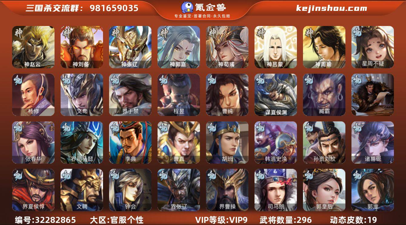 【2753】官阶:骠骑将军;VIP等级:VIP9;史诗武将数量:25;动态皮肤数量:19;武将总数:296;史诗宝珠数量:3;将魂数量:1858;神将:5;魏国史诗武将:10;蜀国史诗武将:5;吴国史诗武将:4;群史诗武将:7