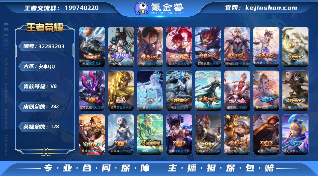 安卓Q-V8-永恒钻石II段位-127英雄-270皮肤-1典藏皮肤-1珍品传说-26传说-74史诗 【英雄全皮】:橘右京全皮,司空震全皮,影全皮 【荣耀典藏】:李白鸣剑曳影 【珍品传说】:马可波罗怪盗基德 【传说皮肤】:司空震愿照山河定,女娲愿照千秋盛,妲己愿照众生和,澜愿照九州拓,蔡文姬愿照福禄聚,虞姬愿照岁时盈,云缨幻光神枪,桑启鸣野蒿,露娜霜月吟,东皇太一灼幽烈阳,橘右京枫霜尽,马可波罗深海之息,后羿无尽星芒,赵云淬星耀世,王昭君乞巧织情,西施游龙清影,曜李逍遥 ,公孙离祈雪灵祝,诸葛亮时雨天司,铠绛天战甲,镜炽阳神光,虞姬启明星使,李信一念神魔,刘备时之恋人,貂蝉仲夏夜之梦,狄仁杰超时空战士 【限定皮肤】:姜子牙天穹之誓,狄仁杰阴阳师,赵云皇家上将,赵云引擎之心,墨子神迹守卫,嬴政优雅恋人,庄周高山流水,高渐离死亡摇滚,钟无艳王者之锤,芈月幻夜卜梦,元歌云间偶戏,元歌无心,夏侯惇朔风刀,甄姬游园惊梦,马可波罗逐梦之星,马可波罗深海之息,狄仁杰魔术师,狄仁杰万华元夜,达摩沙漠行僧,项羽海滩派对,老夫子醍醐杖,老夫子航海奇遇记,程咬金演武夺筹,韩信逐梦之影,韩信傲雪梅枪,兰陵王金庭之子,花木兰默契交锋,橘右京枫霜尽,亚瑟潮玩骑士王,牛魔御旌,后羿无尽星芒,李元芳云中旅人,虞姬启明星使,钟馗驱傩正仪,干将莫邪冰霜恋舞曲,雅典娜黎明之约,鬼谷子原初探秘者,诸葛亮时雨天司,黄忠火炮绅士,苏烈千军破阵,百里玄策原初追逐者,弈星混沌棋,梦奇顽趣,公孙离祈雪灵祝,沈梦溪大漠名商,明世隐疑决卦,裴擒虎李小龙,裴擒虎擒涛扼浪,云中君纤云弄巧,伽罗天狼溯光者,盾山御銮,上官婉儿梁祝,嫦娥拒霜思,曜李逍遥 ,西施玲珑珍味,西施至美乘鲤谣,鲁班大师探海日志,桑启海盐诗旅,戈娅驭风魔法,艾琳女武神,艾琳流音漫舞,司空震地狱燃心...