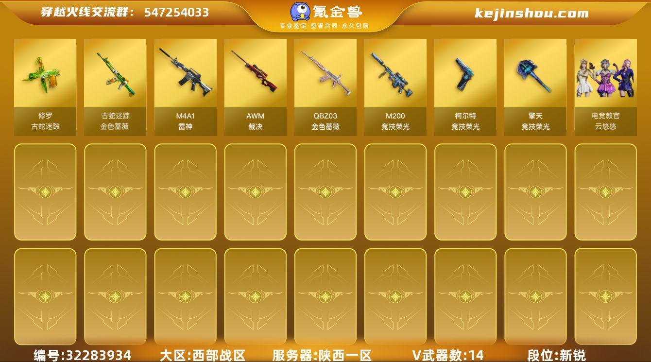 【930854】陕西一区-15V-0王者-0炫金 【热门武器】:QBZ03-金色蔷薇,金色蔷薇-古蛇迷踪,修罗-古蛇迷踪,M200-竞技荣光 【角色】:电竞教官-云悠悠,蛇隐宗,风暴女,蛇姬 【英雄级武器】:M4A1-雷神,金色蔷薇-古蛇迷踪,QBZ03-金色蔷薇,AWM-裁决,M200-竞技荣光,柯尔特-竞技荣光,修罗-古蛇迷踪,擎天-竞技荣光,高爆手雷-竞技荣光*3,高爆手雷-古蛇迷踪,闪光弹-竞技荣光*2,烟雾弹-竞技荣光*3,烟雾弹-古蛇迷踪 【道具】:古蛇迷踪炫彩背包,超级背包,夺命之镰,防化服,金色流光-枪王排位,枪王排位28赛季金色流光,枪王排位29赛季金色流光,古蛇迷踪打击特效,蛇隐宗表情,防弹头盔*3,防弹衣*3,C4工具钳*3,手雷包*3 【特殊枪械】: