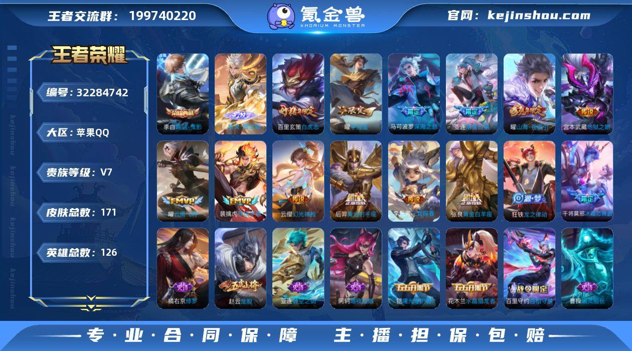 [17518401]V7 1典藏 2无双 16传说 126英雄 171皮肤 可修改实名 男号 【英雄全皮】敖隐全皮,孙权全皮,蚩奼全皮,曜全皮,影全皮,大禹全皮 【稀有英雄】敖隐(小龙人),大司命,嬴政(始皇帝),韩信(韩跳跳),橘右京(橘子),娜可露露(鸟人),不知火舞,赵云,金蝉(唐僧),戈娅 【荣耀水晶】鸣剑·曳影 【无双皮】无相,器灵·螭龙剑 【传说皮】神骥·逐星野,落雪白狼,幻光神枪,祥瑞亨通,李逍遥,黄金射手座,黄金白羊座,地狱之眼,云鹰飞将(小将军),飞鸢探春,超时空战士-狄仁杰,山海·苍雷引(电光曜子) 【珍宝阁皮】妄想食味 【赛季/战令皮】噬灭天穹(s37),古海寻踪(s33),擒涛扼浪(s31),探海日志(s32),流音漫舞,剑破天穹(s35),天穹祈灯(s34),天穹之誓(s36),蔡文姬夏日便利店,虞姬夏日便利店,演武夺筹(s23),驱傩正仪(s24),沙漠行僧(s26),大漠名商(s28),云中旅人(s29) 【史诗皮】百晓客,破空之剑,星界战将,百相守梦-百里守约,茶境仙,线条小狗-周瑜,九幽镇关,线条小狗-小乔,巫礼祀神,光弋星穹,龙之律动,百相守梦-黄忠,紫霞仙子,蒙恬荣光圣徽,高渐离燃音魔法,冰冠公主,偶像歌手,龙骑士(小龙虾),暗夜猫娘,猫狗日记-孙策,乱世虎臣,修罗,摇滚巨星,水果甜心,天才门将,暗隐猎兽者,幽灵船长,鬼剑武藏,天秀·启明...