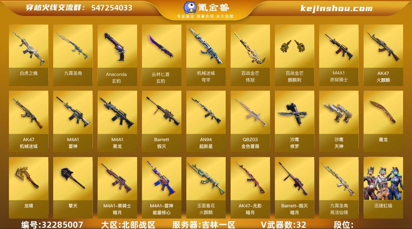 E193949(九霄圣角三件套+白虎)cf北部/吉林一区/32V/九霄圣角(满级)+高洁仙境+九霄圣角音效卡+九霄圣角玩偶+王者九霄圣角玩偶/白虎之魄+王者凌虎/火麒麟/黑龙/雷神/超新星/QBZ金色蔷薇*4/多皮可排