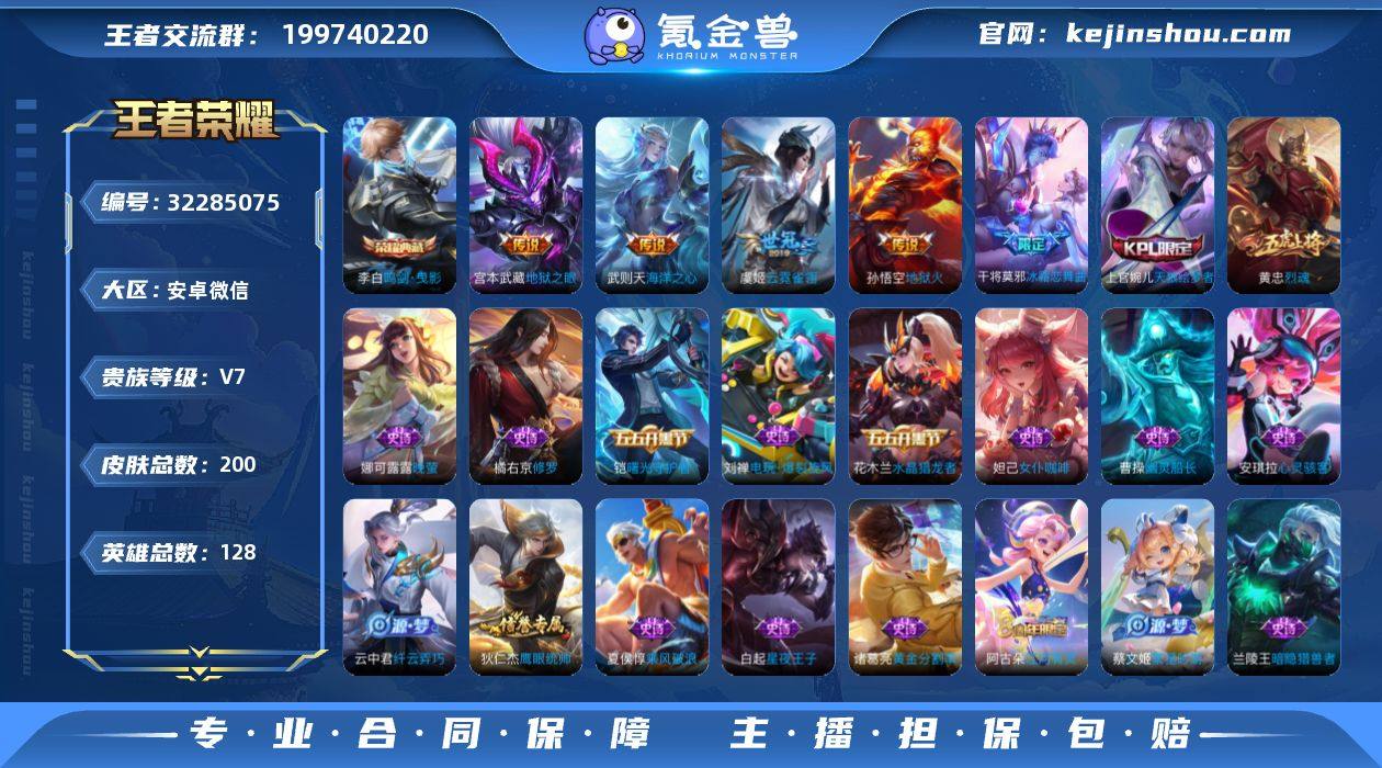 安卓Q-V7-至尊星耀V段位-127英雄-203皮肤-1典藏皮肤-11传说-64史诗 【英雄全皮】:影全皮,海诺全皮 【荣耀典藏】:铠银白咏叹调 【传说皮肤】:澜愿照九州拓,云缨幻光神枪,桑启鸣野蒿,澜逐花归海,孙悟空齐天大圣,曜山海苍雷引,李信山海炽霜斩,吕布怒海麟威,马超无双飞将,镜炽阳神光,宫本武藏地狱之眼 【限定皮肤】:姜子牙天穹之誓,狄仁杰阴阳师,赵云皇家上将,钟无艳超时空战士,吕布猎兽之王,元歌云间偶戏,元歌无心,马可波罗暗影游猎,马可波罗山海玄木吟,狄仁杰魔术师,达摩沙漠行僧,项羽海滩派对,关羽百相守梦,兰陵王金庭之子,孙悟空齐天大圣,李元芳云中旅人,雅典娜黎明之约,鬼谷子五谷丰年,苏烈千军破阵,百里玄策原初追逐者,梦奇顽趣,沈梦溪大漠名商,裴擒虎擒涛扼浪,云中君纤云弄巧,李信山海炽霜斩,上官婉儿梁祝,嫦娥拒霜思,嫦娥暖冬兔眠,曜山海苍雷引,西施玲珑珍味,鲁班大师探海日志,桑启海盐诗旅,暃星界游侠,戈娅驭风魔法,艾琳流音漫舞,司空震地狱燃心,阿古朵江河有灵,张良古海寻踪,蒙犽百解令,蒙恬荣光圣徽,高渐离燃音魔法,妲己灵卜魔法,鬼谷子天穹祈灯,姬小满妄想食味,沈梦溪龙舞盛年,鲁班七号蔬乡物语,李元芳蔬乡物语,刘邦剑破天穹,镜青焰无极,项羽苍威无极,海诺心动手记,周瑜熔金海岸 【年限皮肤】:曜山海苍雷引,李信山海炽霜斩,马可波罗山海玄木吟,澜愿照九州拓 【赛季限定】:苏烈千军破阵,达摩沙漠行僧,兰陵王金庭之子,沈梦溪大漠名商,李元芳云中旅人,桑启海盐诗旅,裴擒虎擒涛扼浪,鲁班大师探海日志,张良古海寻踪,鬼谷子天穹祈灯,刘邦剑破天穹,姜子牙天穹之誓,东皇太一噬灭天穹,太乙真人谧流熔炉,亚瑟荣光之誓,百里玄策原初追逐者,雅典娜黎明之约,梦奇顽趣,蒙恬荣光圣徽,牛魔星界战将 【战令限定】:吕布猎兽之...