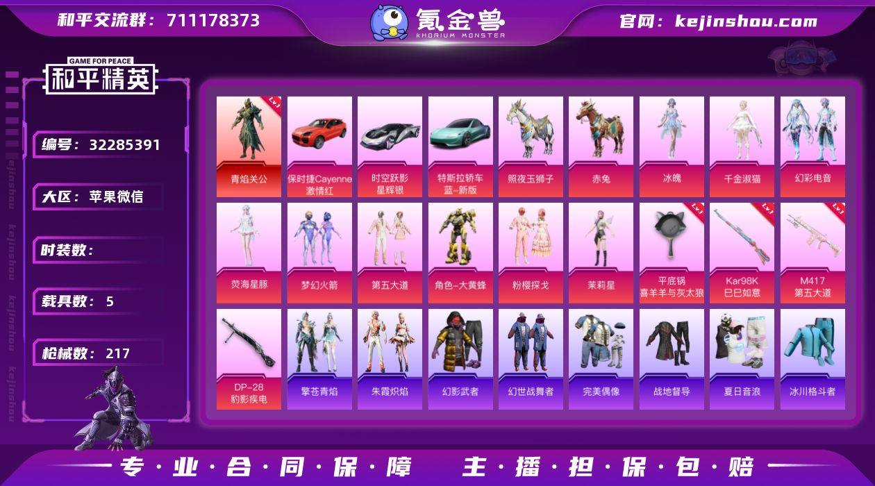 【5级关羽】c26116-【可二次】【因赛季更新游戏段付以上号为准!】 苹果V-1红装5载具10粉装6特效枪9热门156套装217枪皮 18印记 历史绝世王牌21星 【1红装】 青焰关公 (5级) 【5载具】 保时捷Cayenne(激情红) 特斯拉R水滴蓝 时空跃影(星辉银) 照夜玉狮子 赤兔 【10粉装】 冰魄 梦幻火箭 茉莉星 千金淑猫 荧海星豚 异瞳寒姬 粉樱探戈 大黄蜂 幻彩电音 第五大道 【6特效枪】 Kar98K-巳巳如意 (5级) DP-28-豹影疾电 (5级) 蜜獾-异瞳寒姬 (4级) M417-第五大道 (7级) Mk14-福马献瑞 (5级) 平底锅-喜羊羊与灰太狼 (2级) 【9热门】 2P战斗服款 浪漫假日 醒狮腾龙 团圆交子 瑞龙福将 粉红小猪 破蛋小黄鸡 极速红龙 M762-瑞龙福将 【2飞行器】 梦幻火箭飞行器 拂晓神骑飞行器 【1头盔】 梦幻火箭头盔 【1背包】 梦幻火箭背包