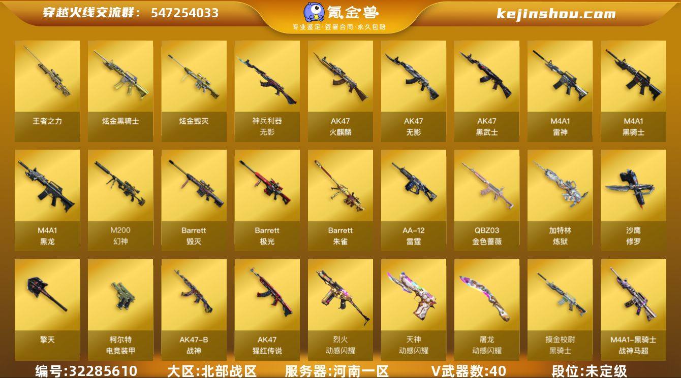 【930985】河南一区-40V-4王者-3炫金【黄忠幻神❤冠军之薇❤朱雀五虎将战神套❤动感闪耀全套❤冠军毁灭白鲨雷神EVEN貂蝉❤顶级生化4炼狱】 【热门武器】:QBZ03-金色蔷薇,M200-幻神,M4A1-黑骑士,加特林-炼狱*4,沙鹰-修罗 【王者炫金武器】:炫金骑士*2,炫金毁灭,王者之力 【音效卡】:M4A1-黑骑士音效卡,Barrett-毁灭音效卡 【稀有皮肤】:M200-幻神-黄忠皮肤,QBZ03-冠军之薇,M4A1-战神赵云*2,雷神-赛博朋克,AK47-火麒麟-传奇EVEN,火麒麟-轻羽皮肤,火麒麟-战神关羽,火麒麟-心动糖果,黑骑士-战神马超,黑骑士-摸金校尉,毁灭-星空,毁灭-战神张飞,烈龙-星空 【角色】:王者-葵-貂蝉,职业选手,青霞仙子 【人偶武器】:AWM-灵狐-15周年嘉年华,迷你牛魔王,闪光弹-小乔 【暴走生化】:超级对讲机 【英雄级武器】:柯尔特-电竞装甲,烈火-动感闪耀,天神-动感闪耀,屠龙-动感闪耀,手雷-动感闪耀,QBZ03-金色蔷薇,无影-神兵利器,M4A1-雷神*2,M4A1-黑龙,M4A1-黑骑士,加特林-炼狱*4,AK47-无影,AK47-火麒麟*3,AK47-黑武士,Barrett-毁灭,Barrett-极光,AA-12-雷霆,Barrett-朱雀,M200-幻神,AK-47-猩红传说*2,AK47-B-战神,沙鹰-修罗,擎天 【特殊枪械】:0...