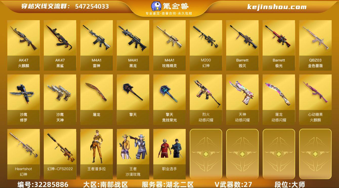 【930914】【幻神2皮】【M200-幻神】【幻神-Heartshot 皮肤】【幻神-CFS2022】【QBZ03-金色蔷薇】【王者芳薇-觉醒版】【乔伊教练】【王者潘多拉】【王者沙漠玫瑰】【修道士】【M4A1-雷神】【雷神-冠军之魄】【AK47-火麒麟】【火麒麟-心动糖果】【M4A1-黑龙】【Barrett-毁灭】湖北二区-27V-3王者-0炫金 【热门武器】:QBZ03-金色蔷薇,M200-幻神,沙鹰-修罗*2 【音效卡】:绝迹语音包 【稀有皮肤】:幻神-CFS2022,幻神-Heartshot 皮肤,雷神-冠军之魄,火麒麟-心动糖果 【角色】:王者潘多拉,王者沙漠玫瑰,职业选手,青霞仙子 【人偶武器】:AWM-灵狐-15周年嘉年华,COP-旗袍 【暴走生化】:超级对讲机 【挑战大师】:冰龙粉碎者-白马银枪 【英雄级武器】:擎天-竞技荣光,高爆手雷-竞技荣光,烟雾弹-竞技荣光,闪光弹-竞技荣光,烈火-动感闪耀,天神-动感闪耀,屠龙-动感闪耀,手雷-动感闪耀,QBZ03-金色蔷薇,M4A1-雷神*2,M4A1-黑龙,M4A1-玫瑰精灵,AK47-火麒麟*2,Barrett-毁灭,Barrett-极光,M200-幻神,AK47-黑鲨,沙鹰-天神,沙鹰-修罗*2,擎天,屠龙 【特殊枪械】:
