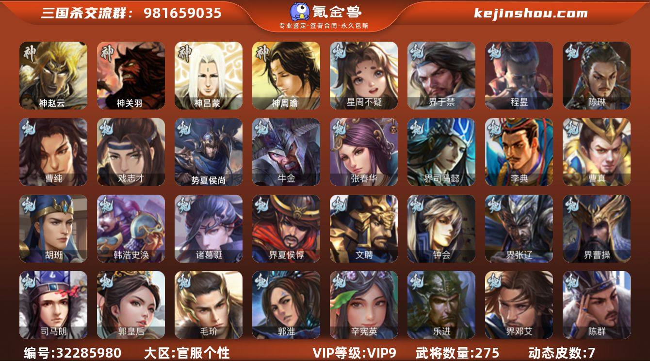 【4257】官阶:骠骑将军;VIP等级:VIP9;史诗武将数量:18;动态皮肤数量:7;武将总数:275;史诗宝珠数量:64;将魂数量:3823;神将:1;魏国史诗武将:2;蜀国史诗武将:1;吴国史诗武将:4;群史诗武将:6 神赵云,星周不疑,界于禁,陈琳,曹纯,戏志才,程昱,周群,吴景,留赞,界朱然,界徐盛,星甘宁,麹义,沮授,公孙康,杜预,兀突骨,神吕蒙,神周瑜,神关羽,势夏侯尚,SP关羽,SP蔡文姬,乐进,曹昂,诸葛诞,朱灵,文聘,SP姜维,张春华,钟会,曹冲,郭淮,满宠,界王异,界曹操,界司马懿,界夏侯惇,界张辽,界许褚,界郭嘉,李典,曹真,韩浩史涣,陈群,曹叡,钟繇,司马朗,王基,郭皇后,辛宪英,吕虔,鲁芝,界荀彧,杜畿,界曹丕,界邓艾,张恭,界曹植,界满宠,卞夫人,辛毗,华歆,崔琰,毛玠,胡班,牛金,SP孙尚香,关银屏,夏侯霸,马良,关兴张苞,廖化,界马岱,关平,简雍,刘封,界法正,界关兴张苞,界刘备,界关羽,界张飞,界赵云,界马超,SP徐庶,吴懿,周仓,张松,刘谌,夏侯氏,黄皓,赵统赵广,界姜维,张翼,杨仪,界廖化,费祎,许靖,谋法正,谋庞统,谋黄月英,谋孟获,谋张飞,谋祝融,诸葛果,界魏延,蒋琬费祎,甘夫人,鲁肃,孙茹,凌操,诸葛恪,诸葛瑾,孙鲁育,程普,韩当,潘璋马忠,虞翻,朱然,界甘宁,界吕蒙,界黄盖,界周瑜,界大乔,界陆逊,孙鲁班,朱桓,...