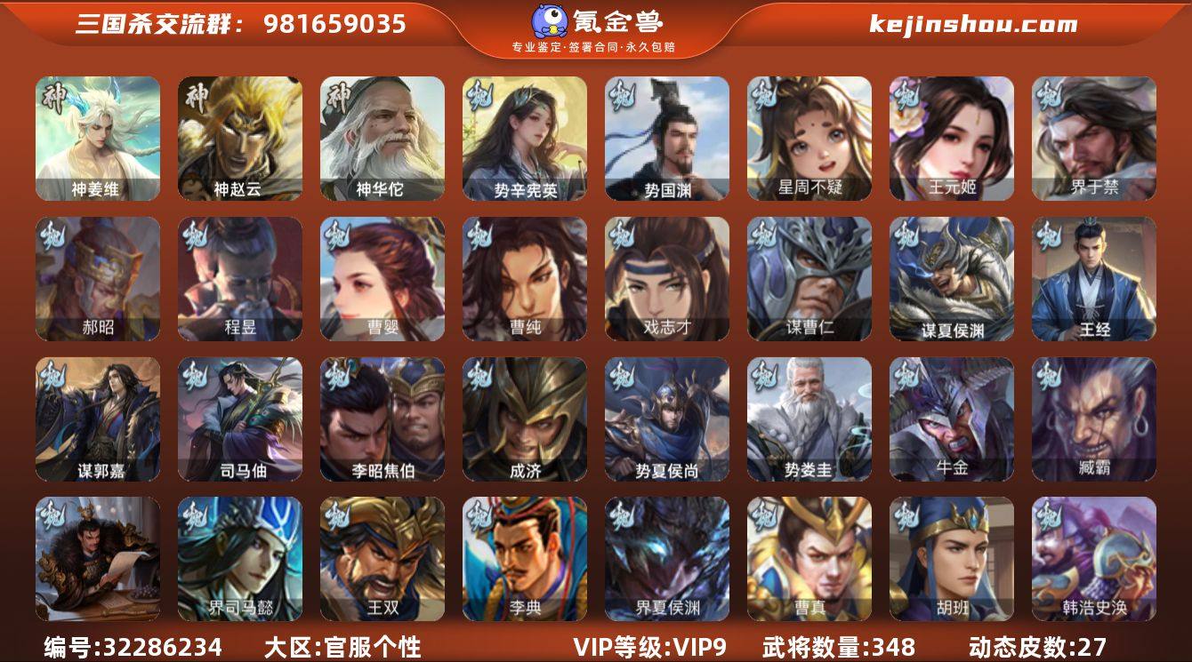 神赵云,神华佗,神姜维,星周不疑,谋曹仁,王元姬,界于禁,郝昭,曹婴,曹纯,戏志才,势国渊,势辛宪英,程昱,马云騄,谋马超,诸葛瞻,赵襄,王平,沙摩柯,谯周,界黄忠,花鬘,董允,界朱然,界徐盛,贺齐,势陆郁生,势太史慈,左慈,张让,星黄忠,星甘宁,审配,沮授,界李儒,谋张角,许攸,谋吕布,星董卓,兀突骨,司马昭,势夏侯尚,SP关羽,SP曹仁,SP蔡文姬,乐进,曹昂,诸葛诞,朱灵,文聘,SP姜维,钟会,曹冲,郭淮,满宠,界王异,界曹操,界司马懿,界夏侯惇,界张辽,界许褚,界郭嘉,李典,曹真,韩浩史涣,陈群,曹叡,钟繇,司马朗,郭皇后,吕虔,鲁芝,界荀彧,杜畿,张恭,贾逵,界曹植,界满宠,卞夫人,华歆,蔡贞姬,袁涣,王双,崔琰,阮慧,谋徐晃,谋于禁,界曹休,牵招,胡班,成济,李昭焦伯,王经,司马伷,谋郭嘉,谋夏侯渊,牛金,界夏侯渊,臧霸,势陈到,SP孙尚香,关银屏,夏侯霸,马良,关兴张苞,廖化,界马岱,关平,简雍,刘封,界法正,界关兴张苞,界刘备,界关羽,界张飞,界赵云,界马超,SP徐庶,吴懿,周仓,张松,刘谌,夏侯氏,李严,黄皓,界黄月英,赵统赵广,...