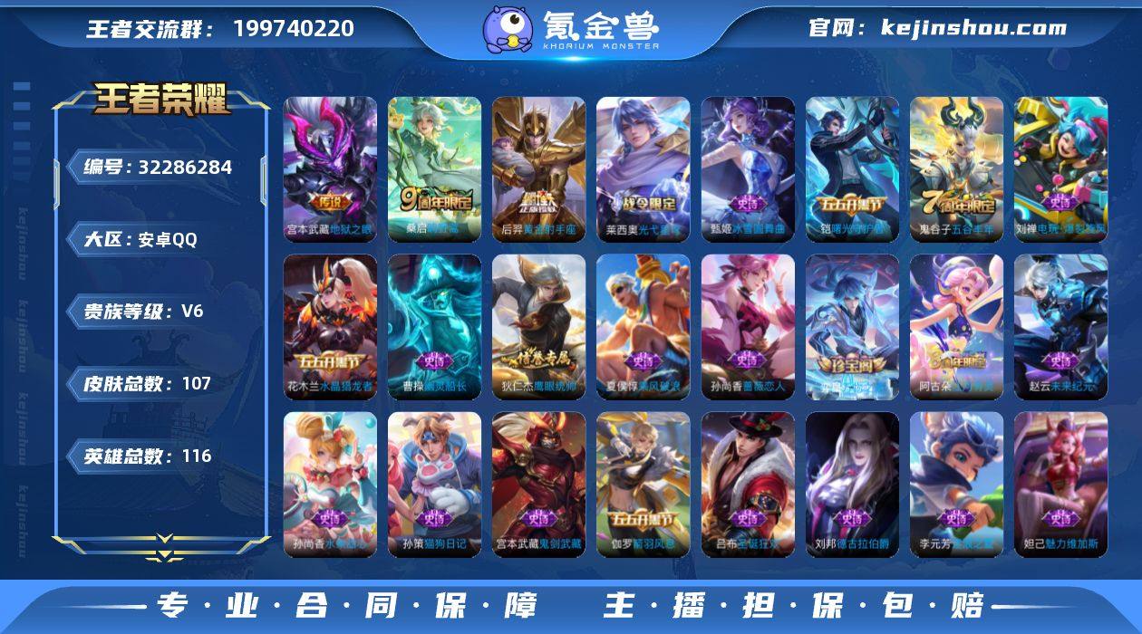 贵族5/皮肤199/传说8/史诗52/英雄126/孙权全皮/刘备全皮/司空震全皮/时之恋人-刘备/星际治安官/时之奇旅-孙策/后羿神树通天/愿照·山河定/愿照·九州拓/幻光神枪/鸣野蒿/一念神魔/超时空战士-狄仁杰/蒙犽顽岩魄/大乔绒语心约/天穹之誓(s36)/阴阳师/皇家上将/山海·玄木吟/魔术师/海滩派对/百相守梦(刘备)/原初追遂者/李小龙/探海日志(s32)/海盐诗旅(s30)/流音漫舞/地狱燃心/江河有灵/古海寻踪(s33)/百解令(蒙犽)/鬼谷子天穹祈灯(S34)/妄想食味/龙武盛年/蔬乡物语(鲁班七号)/蔬乡物语(李元芳)/剑破天穹(s35)/程咬金群星魔术团/青焰无极/苍威无极/刘备异域游侠/熔金海岸/噬灭天穹(s37)/谧流熔炉/虚灵犬护/逆浪荇歌/亚瑟荣光之誓/星界战将/项羽九幽镇关/破空之剑/神迹守卫/百相守梦-百里守约/百相守梦-老夫子/茶境仙/访茗客/苍穹之光/紫霞仙子/冰雪圆舞曲/偶像歌手/地狱岩魂/鬼剑武藏/水果甜心/摇滚巨星/女仆咖啡/金属风暴/幽灵船长/千年之狐/末日机甲-吕布/乱世虎臣/水晶猎龙者/暗隐猎兽者/心灵战警/特工魅影/曙光守护者/天才门将/星夜王子/节奏热浪/猫狗日记-孙策/鹰眼统帅/魅语/天秀·启明/暗渊魔法/永昼/赏金猎手/星界特工/化蝶舞/龙之律动/百相守梦-黄忠/女娲万灵启世/教廷特使/街头霸王/大发明家/白执事/忍·炎影/红桃皇后/白色死神/化身博士/未来纪元-宫本武藏/天使之翼/少女阿狸/黄金武士/死亡骑士/拳王/万事如意/阿尔法小队/纽约教父/汉昭烈帝/龙腾万里/功夫老勺/沉稳之力/掌控之力/幻乐之宴/虹云星官/野性能量/鲨炮海盗猫/次元突破/黑桃队长/特工战影/秘密基地/次元傲视/乓乓大师/潮玩牛仔/唤灵魔甲/契约魔法/胡桃狂想曲/蔚蓝守将/潮玩造梦师/幻泉雾影-海月/潮玩探月行/零食大作战/妄想特派/热血海滩/聚星闪耀/幻夜行动/决胜大满贯/漠中幻影/功夫炙烤/春野之旅/无尽旅途/经纬探寻者/暗都幽影/长夏之忆/敬我三分/...