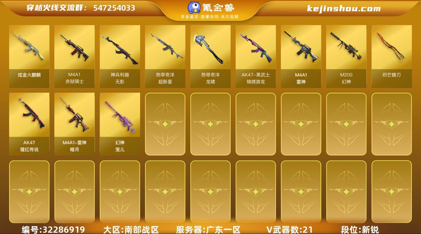 【931064】广东一区-21V-0王者武器数-1炫金武器数 【热门武器】:M200-幻神,死亡之眼,炽芒蝶刃 【王者炫金武器】:炫金火麒麟 【音效卡】:M200-幻神音效卡 【皮肤】:幻神-宠儿-2021MVP,雷神-暗月,轻型军用手斧-再燃火线 【角色】:奇洋探员,乔伊教练,修道士,北极狐-X,飞虎队-X,风暴女,嘉年华灵狐,麻雀,潘多拉-X,蛇姬,斯沃特-X,兔囡囡,影武者-X,游珑儿 【人偶武器】:AWM-灵狐-15周年嘉年华,迷你牛魔王,迷你波特博士,迷你牛牛 【暴走生化】:死亡之眼 【挑战大师】:冰龙粉碎者-白马银枪,神圣爆裂者-末日III 【英雄级武器】:M4A1-雷神,无影-神兵利器,黑武士-锦绣游龙,超新星-热带奇洋,AK-47-猩红传说,M200-幻神,炽芒蝶刃,龙啸-热带奇洋,高爆手雷-云龙*2,手雷-热带奇洋,闪光弹-云龙*3,烟雾弹-云龙*2,M4A1-赤狱骑士 【道具】:云山科技背包,亚洲杯纪念炫彩背包,全能枪王背包,奇洋探员-海龟背包,热带奇洋炫彩背包,超级背包,哔哩哔哩名片,女皇终结者-魔龙之吻,救世主-黑桃战神,绿色巨人,灵魂忍者*2,迷雾幽灵*2,夺命之镰,防化服*3,金色流光-枪王排位*2,星辰流光-枪王排位,流光-鎏金之域,枪王排位28赛季金色流光,枪王排位29赛...
