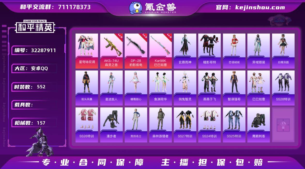 【特价出售】安卓Q-1粉装6特效枪6热门138套装157枪皮 44022热力值 11印记 历史超级王牌18星 【1粉装】 星穹咏叹调 【6特效枪】 AKS-74U-森灵之息 (5级) Kar98K-巳巳如意 (5级) DP-28-豹影疾电 (5级) AKS-74U-森灵之息 (5级) Mk14-福马献瑞 (5级) UMP45-萌骑冒险 (5级) 【6热门】 龟仙人 鹰眼刺客 暗影哥特 漫步者 韶华初心 破蛋小黄鸡 【1背包】 深海曼妙背包