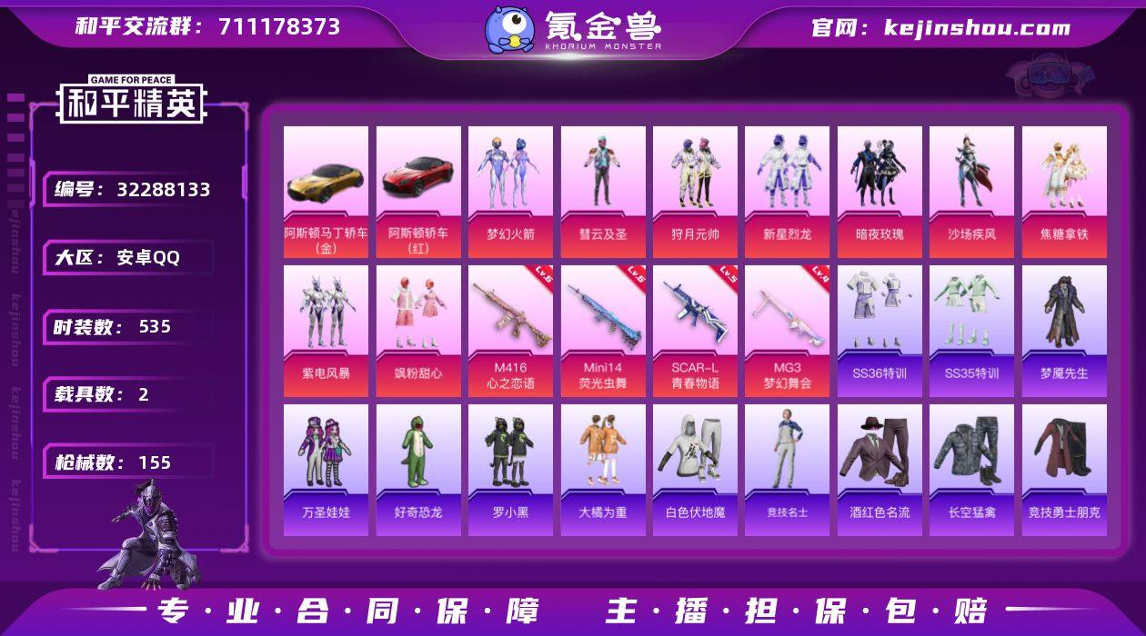 安卓 手Q-1神装-3粉装-12特效枪-2载具-4粉色飞行器-46431热力值-1王牌印记-74套装-140枪皮 【红色神装等级】:盛世惊鸿-云鸾(一级) 【红色角色神装】:盛世惊鸿-云鸾 【热门品类】:粉装-梦幻火箭,角色-军刀雅典娜,角色-Mark.06 【粉色套装】:粉装-梦幻火箭,粉装-莲影清波,角色-女娲灵识 【粉色枪皮等级】:AKM-绿萝繁花(五级),SCAR-L-梦幻火箭(一级),SCAR-L-金蛇镇世(三级),M416-至情至圣(七级),M416-电玩时刻(五级),GROZA-镜光银凌(四级),AUG-暖羊咩咩(五级),M762-青锋波束(五级),UMP45-量子极限(五级),Kar98K-巳巳如意(五级),M24-莲影清波(四级),莫辛纳甘-未来领航者(三级) 【粉色载具】:盛世惊鸿摩托车,护世瑞兽 【粉色枪皮】:AKM-绿萝繁花,SCAR-L-梦幻火箭,SCAR-L-金蛇镇世,M416-至情至圣,M416-电玩时刻,GROZA-镜光银凌,AUG-暖羊咩咩,M762-青锋波束,UMP45-量子极限,Kar98K-巳巳如意,M24-莲影清波,莫辛纳甘-未来领航者 【粉色飞行器】:梦幻火箭飞行器,齐天大圣飞行器,凤舞九天飞行器,万象金身飞行器 【粉色降落伞】:梦幻火箭降落伞,环太平洋降落伞,闲梦青缨降落伞,圣堂之誓降落伞,江南烟雨降落伞,BEARBRICK降落伞,盛世惊鸿降落伞,金蛇镇世降落伞,月下星之子降落伞 【稀有套装】:套装-巳巳如意,套装-雏菊兔兔,套装-萝兰蝴蝶,套装-小熊娃娃,套装-糖糖葫芦,套装-青团波波,套装-棉花软糖,角色-许七安,套装-燕燕于飞,套装-鱼渊荷华,角色-绛羽幽主 【稀有枪皮】:AKM-环太平洋,AKM-龙的传人,M16A4-幻世战舞者,SCAR-L-夜灯,SCAR-L-炫彩节奏,SCAR-L-红色方程式,M416-糯团青竹,M416-蓝色火焰,AUG-天降萌叽,AUG-甜蜜菠萝,AUG-耀粉歌者,AUG-金蛇镇世,QBZ-彩虹符号,QBZ-绚金瑰梦,M762-天降萌叽,M762-暖熊萌萌,Mk47-妙红点点,Mk47-炫光之旅,AC-VA...