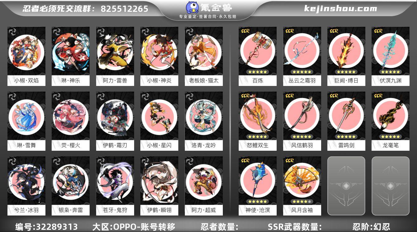 忍阶:幻忍 阿力·超威,阿力·雷兽,苍牙·绯斩,苍牙·鬼狩,隼白·夜叉,老板娘·猫太,洛青·龙吟,琳·神乐,琳·雪舞,小椒·双焰,卫鲤·剑心,小黑·龙焰,小黑·炎魂,小椒·神炎,小椒·星闪,兮兰·冰羽,伊鹤·瞬翎,伊鹤·霜刃,荧·樱火,银枭·奔雷 五星百炼,五星丛云之霜羽,五星巨阙·缚日,五星伏溟九渊,五星怒鲤双生,五星风信鹤羽,五星雷鸣剑,五星龙毫笔,五星神使·沧溟,四星风月含袖 卖家说:有永久忍界契约,二区有号