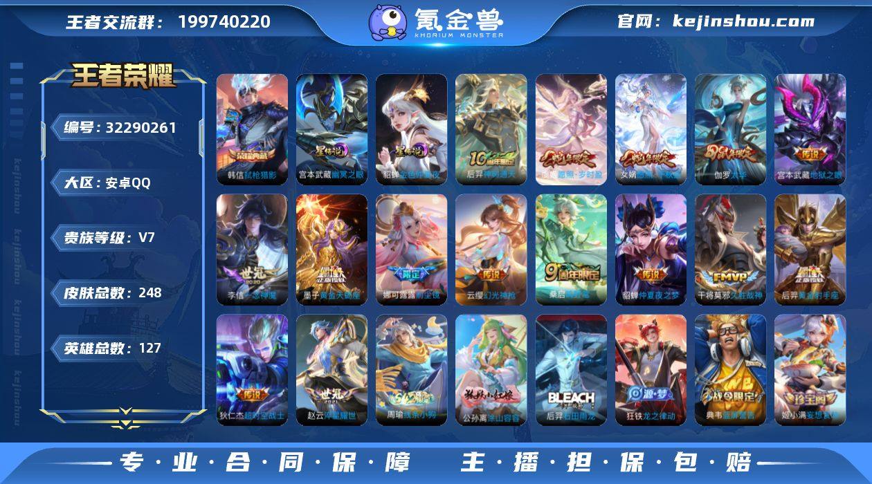 【特价出售/店主推荐】发育路32段,安卓Q-V7-最强王者段位-127英雄-224皮肤-1典藏皮肤-2珍品传说-2星传说-12传说-62史诗 【英雄全皮】:影全皮 【荣耀典藏】:李白鸣剑曳影 【珍品传说】:伽罗沧流箭,宫本武藏黑崎一护 【传说皮肤】:后羿神树通天,澜愿照九州拓,马可波罗深海之息,曜云鹰飞将,干将莫邪久胜战神,虞姬云霓雀翎,达摩黄金狮子座,百里玄策白虎志,梦奇胖达荣荣,后羿黄金射手座,宫本武藏地狱之眼,吕布天魔缭乱 【限定皮肤】:姜子牙天穹之誓,狄仁杰阴阳师,廉颇寅虎御盾,赵云皇家上将,嬴政优雅恋人,孙尚香蔷薇恋人,高渐离死亡摇滚,钟无艳超时空战士,扁鹊奇幻香踪,吕布天魔缭乱,元歌无心,甄姬落雪兰心,马可波罗深海之息,狄仁杰魔术师,项羽海滩派对,王昭君午后时光,孙悟空至尊宝,李元芳云中旅人,杨玉环寅虎心曲,杨戬潮玩骑兵,鬼谷子五谷丰年,百里玄策白虎志,百里守约朱雀志,沈梦溪大漠名商,裴擒虎擒涛扼浪,狂铁电玩高手,嫦娥暖冬兔眠,蒙犽狂想玩偶喵,鲁班大师探海日志,桑启海盐诗旅,暃星界游侠,艾琳流音漫舞,司空震地狱燃心,张良古海寻踪,蒙犽百解令,蒙恬荣光圣徽,鬼谷子天穹祈灯,周瑜熔金海岸 【年限皮肤】:百里玄策...