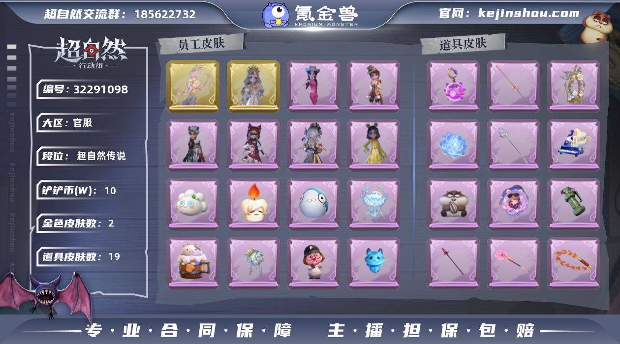 金皮2;紫皮7;道具皮15;皮肤:薇薇安-海月息潮,兰-春之声,薇薇安-白光莹,小黄-呱呱雨衣,逍遥-绣春逍影,艾伦-黎明猎手,阿念-庆宴绮愿,爱丽丝-耀眼的你,巫铃儿-琢玉怀乡;道具:摸金符-紫霄,腰包-惊魂娃娃,闪光弹-金戈玄铜,葫芦-海心凝珠,音响-鸣沙鼓,喷气背包-乘风溯雪,长鞭-缚誓之锁,音响-月光奏鸣曲,转轮手枪-新星时代,刺刀-碧络琅环,刺刀-小鲨匕首,刺刀-铂刺与红萼,急救包-蔷薇物语,腰包-红运福虎,摸金符-海洋之心;饰品:头饰-蒜了八,头饰-惊魂南瓜头套,头饰-萨卡班甲鱼头套,头饰-哈士奇头套,头饰-马上有钱,头饰-腊肠扭扭,头饰-滑稽头套,头饰-雪墩墩头套,头饰-烈焰红唇头套,头饰-饺饺者头套,头饰-樱桃奶油布丁,头饰-卑微头套,头饰-鱼头怪头套,头饰-芝麻糊汤圆,头饰-烛光纪念,头饰-呆滞头套,头饰-大葱明头套,头饰-嘻嘻头套,头饰-面具马头套,头饰-太空鲨头套,头饰-小财神豚豚头套,头饰-火爆了头套,头饰-像素朋克墨镜,头饰-后室幸存者头套,挂饰-天使消失的年代,挂饰-钗头凤,挂饰-糖果守卫,挂饰-孤独对望,挂饰-不朽的今夜,背饰-绒团小狐狸,背饰-天使的呼唤,背饰-小小罗丽,背饰-牛啤背包;动作:动作-舞台中心,动作-心跳摇,动作-青海摇,动作-新年摇,动作-luvaboy,动作-刀马舞,动作-拜年,动作-抬手,动作-要糖,动作-举牌,动作-KT猫摇,动作-蝴蝶步;工牌背景:工牌背景-珊瑚海,工牌背景-永夜巡礼,工牌背景-甜酷指令,工牌背景-点点萌伴,工牌背景-流金照庭,工牌背景-圣光之誓,工牌背景-琢玉成佩,工牌背景-心同野鹤,工牌背景-雷霆轩,工牌背景-甜心的囚笼;工牌动作:工牌动作-蜕变,工牌动作-虔诚之姿,工牌动作-净禅;员工:小黄,员工-阿念,员工-莉莉,员工-逍遥,员工-艾伦,员工-兰,员工-薇薇安,员工-爱丽丝,员工-临云,员工-爱德华,员工-零,员工-巫铃儿,员工-小满;累充454元;铲铲币367.8万;金砖26;段位:超自然传说158...