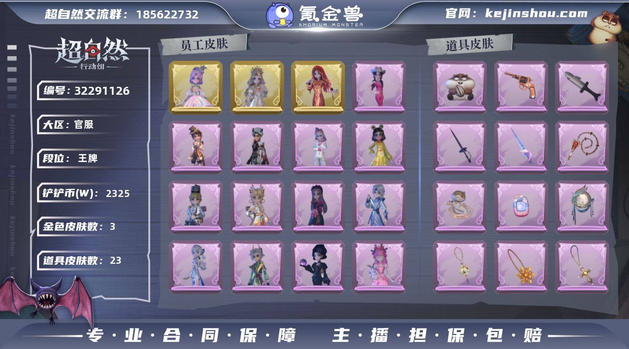 【Q1462】【段位】超自然传说 【幻梦皮肤数量】0 【星耀限定皮肤数量】0 【金色皮肤数量】3 【紫色皮肤数量】15 【道具皮肤数量】20 【铲铲币】461w 【累充】14030金砖 【赛季魔盒】普通魔盒 【员工】小黄、爱丽丝、零、阿念、逍遥、薇薇安、巫铃儿、莉莉、艾伦、爱德华、兰、小满、临云 【金色皮肤】莉莉-瑶台梦、逍遥-莲华渡、薇薇安-圣光之谕 【紫色皮肤】艾伦-黎明猎手、临云-织锦云程、阿念-庆宴绮愿、爱丽丝-耀眼的你、兰-千夜星谕、阿念-迷途僵宝、莉莉-除妖小师妹、薇薇安-黑月挽歌、阿念-王子与骑士、薇薇安-白光莹、零-青云逸歌、巫铃儿-素影瑶光、爱丽丝-丝缕哀歌、逍遥-绣春逍影、小黄-呱呱雨衣 【道具皮肤】摸金符-祝祷词、腰包-宝剑八、长鞭-缚誓之锁、长鞭-飞天绫、桃木剑-永眠曲、急救包-蔷薇物语、铲子-龙鳞、刺刀-碧络琅环、电击枪-甜蜜泡泡枪、转轮手枪-新星时代、短管猎枪-星光的裁决、铲子-圣心之泪、刺刀-紫气东来、闪光弹-金戈玄铜、额外的背包-飞花令、腰包-月下莲台、音响-鸣沙鼓、背饰-梵音莲华、背饰-天使的呼唤 【头饰】饺饺者、马上有钱、烛光纪念、蒜了八、精致露比头套、小财神豚豚头套、鱼头怪头套、烈焰红唇头套、大葱明头套、火爆了头套、面具马头套、哈士奇头套、萨卡班甲鱼头套、嘻嘻头套、滑稽头套、呆滞头套、卑微头套、鳄霸天头套、驼半仙头套、炙热烧烤、像素朋克墨镜、后室幸存者头套 【挂饰】孤独对望、天使消失的年代、钗头凤 【动作】新年摇、知世摇、luvaboy、心跳摇、舞台中心、姬芽摇、拜年、蝴蝶步、山楂树之舞、律动迪斯科、举牌、抬手、旋转舞、KT猫摇