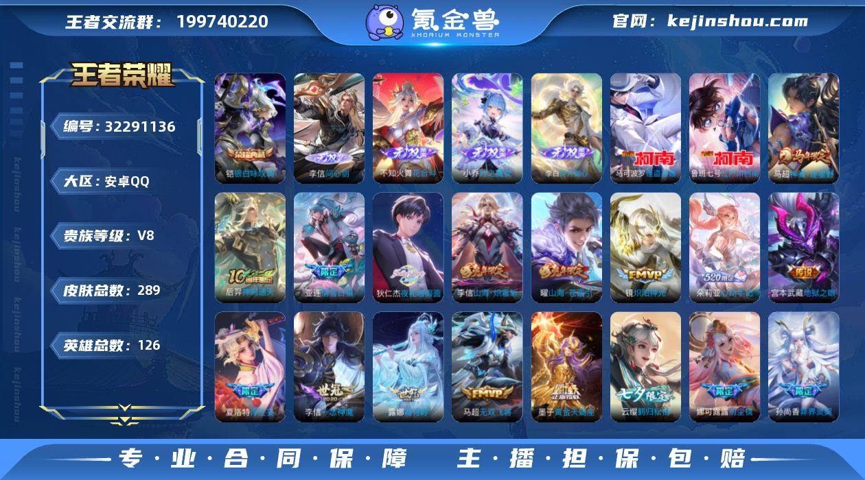 贵族等级:V8 典藏皮肤数:1 珍品无双皮肤数:0 无双皮肤数:4 珍品传说皮肤数:2 传说皮肤数:33 史诗皮肤数:72 皮肤数:289 英雄数:126 段位:荣耀王者 卖家说:本赛季万战火舞,万战露露,排位80星,明天之前卖不出去就撤了