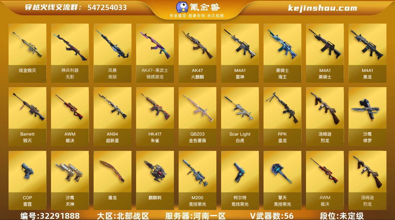 【ky5168】广东一区-62V-4王者武器数-3炫金武器数 【热门武器】:QBZ03-金色蔷薇*3,HK417-朱雀,M200-幻神,M4A1-黑骑士*2,汤姆逊-烈龙*2,Knife-冠军之刃 【王者炫金武器】:王者之力,炫金雷神,炫金毁灭,炫金修罗 【皮肤】:M200-幻神-黄忠皮肤,幻神-冠军之幻,幻神-荣耀世冠EP 皮肤,QBZ03-荣耀世冠白鲨,QBZ03-巅峰荣耀皮肤,QBZ03-荣耀世冠EP 皮肤,烈龙-星空,雷神-荣耀之魄,雷神-星空,雷神-虎将,雷神-维纳斯皮肤,火麒麟-华夏之心,火麒麟-平天大圣,毁灭-星空*2,毁灭-冠军之怒,黑骑士-AG-S4冠军典藏,黑骑士-破浪10年皮肤,无影耀金皮肤,修罗-能量核心*2 【角色】:葵,妮妮,王者凌霄,乔伊教练,初恋灵狐,电竞少女,芳心审判者,风暴女,兰-海滩派对,灵动武士,灵狐-花神,灵狐者-X,灵狐者-职业经理,曼陀罗-礼服,铁骑荣耀,维纳斯,幽,游珑儿 【人偶武器】:白虎-迷你小艾 【挑战大师】:神圣爆裂者III,激光毁灭者III 【英雄级武器】:AK47-火麒麟,M4A1-黑龙*3,M4A1-雷神*2,M4A1-黑骑士*2,AN94-超新星*2,M4A1-武圣*2,AK47-黑鲨,HK417-朱雀,M4A1-玫瑰精灵,QBZ03-金色蔷薇*3,烈火-动感闪耀,AK-47-猩红传说,王者白虎-觉醒版,王者芳薇-觉醒版,AWM-天龙,Barrett-毁灭,Barrett-极光,M200-幻神,王者之力-觉醒版,汤姆逊-烈龙*2,沙鹰-天神*5,天神-动感闪耀,屠龙*3,龙啸*2,擎天,屠龙-动感闪耀,斩神刀-雷暴,高爆手雷-雷霆,高爆手雷-雷暴*2,手雷-动感闪耀,高爆手雷-云龙,闪光弹-雷霆,闪光弹-雷暴*2,闪光弹-云龙,烟雾弹-雷霆,烟雾弹-雷暴*2,烟雾弹-云龙,烟雾弹-荣耀世冠EP,M4A1-赤狱骑士 【道具】:炫彩背包,哔哩哔哩名片,女皇终结者-魔龙之吻,救世主-黑桃战神,绿色巨人,灵魂忍者,迷雾幽灵,夺命之镰,防化服*2,金色流光-枪王排位*2,星辰流光-枪王...