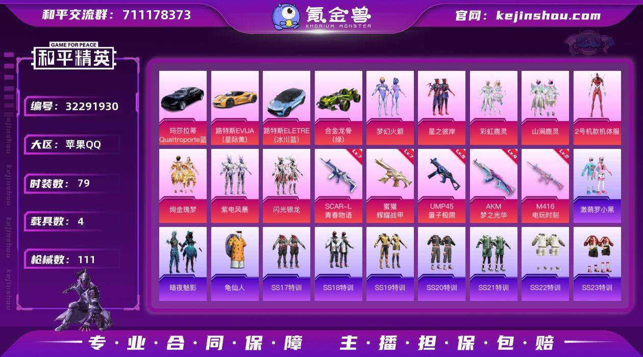 【AZH3111】苹果 手Q【梦幻火箭红螳螂 满级青春物语SCAR-L 满级蜜獾-辉耀战甲 4载具】8粉装-5特效枪-4载具-4粉色飞行器-42450热力值-14王牌印记-79套装-111枪皮 【热门品类】:粉装-梦幻火箭,套装-龟仙人 【粉色套装】:粉装-梦幻火箭,粉装-星之彼岸,粉装-彩虹鹿灵,粉装-山涧鹿灵,角色-2号机款机体服,粉装-绚金瑰梦,粉装-紫电风暴,粉装-闪光银龙 【粉色枪皮等级】:AKM-梦之光华(四级),SCAR-L-青春物语(七级),M416-电玩时刻(二级),蜜獾-辉耀战甲(七级),UMP45-量子极限(五级) 【粉色载具】:路特斯EVIJA(星际黄),路特斯ELETRE(冰川蓝),玛莎拉蒂Quattroporte(夜幕蓝),合金龙骨(绿) 【粉色枪皮】:AKM-梦之光华,SCAR-L-青春物语,M416-电玩时刻,蜜獾-辉耀战甲,UMP45-量子极限 【粉色飞行器】:青春物语飞行器,庄周梦蝶飞行器,闪光银龙飞行器,镜域双华-灵镜之阶 【粉色降落伞】:星之彼岸降落伞,绚金瑰梦降落伞,天之羽翼降落伞,碧影闪光降落伞,闪光银龙降落伞,垂柳戏鸭降落伞,旋转彩虹降落伞,海螺星光降落伞,辉耀战甲降落伞,忍者神龟降落伞 【稀有套装】:套装-龟仙人 【稀有枪皮】:AKM-彩虹符号,AKM-恐龙拽拽,AKM-星之彼岸,AKM-星兔领...