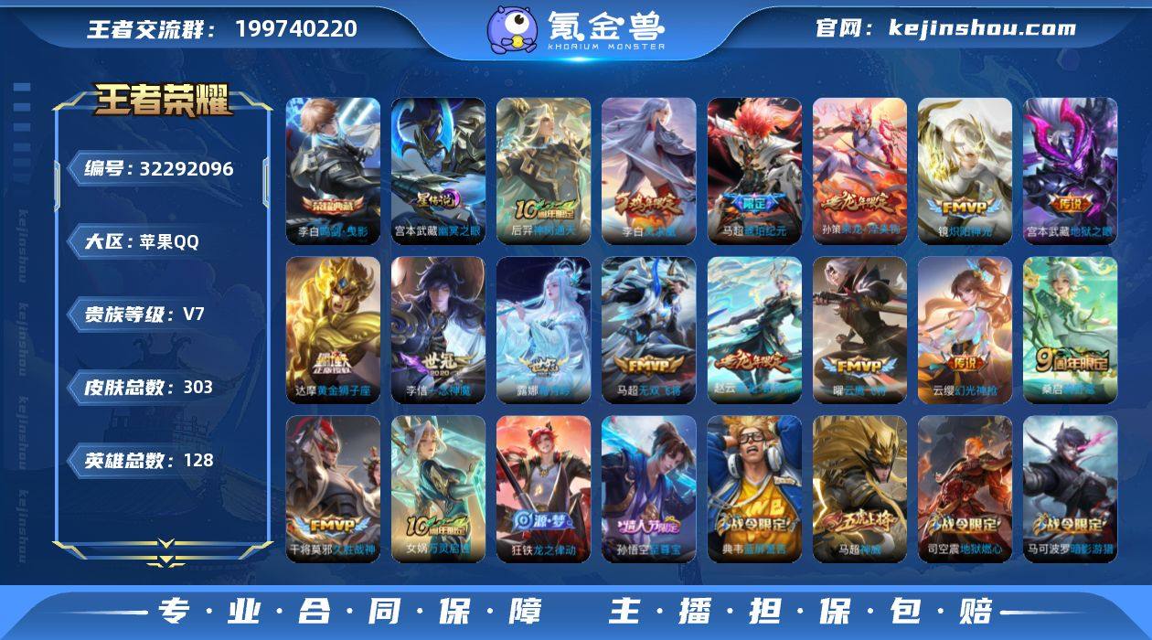 贵族7/皮肤303/典藏1/传说15/史诗94/英雄128/影全皮/鸣剑·曳影/幽冥之眼/神树通天/幻光神枪/鸣野蒿/乘龙·淬吴钩/乘龙·铭钟鼎/琥珀纪元马超/霜月吟/无双飞将/炽阳神光/云鹰飞将/一念神魔/久胜战神/黄金狮子座/凤求凰/地狱之眼/天穹之誓(s36)/破阵·退雄兵/阴阳师/皇家上将/神迹守卫-墨子/白昼王子/蔷薇恋人/高山流水/死亡摇滚/玩趣恶龙/迷踪丽影/超时空战士-钟无艳/幻夜卜梦/猎兽之王/赤莲之焰/云间偶戏/无心/朔风刀(s17)/落雪兰心/蓝屏警告/暗影游猎/魔术师/万华元夜(s22)/星际陆战队-达摩/沙漠行僧(s26)/海滩派对/醍醐杖(s20)/航海奇遇记/冰锋战神/演武夺筹(s23)/夺宝奇兵/傲雪梅枪/驯魔猎人/金庭之子(s27)/默契交锋-花木兰/潮玩骑士王/至尊宝/御旌(s15)/圣弓游侠/银河之约/云中旅人(s29)/驱傩正仪(s24)/遇见飞天/朔望之晖/真爱魔法/单词大作战/黎明之约/繁星吟游/华丽摇滚/原初探秘者(s21)/五谷丰年/火炮绅士/青龙志/千军破阵(s25)/原初追遂者/朱雀志/混沌棋(s18)/顽趣-梦奇/星空之诺/大漠名商(s28)/疑决卦(s19)/李小龙/擒涛扼浪(s31)/御狮(s13)/御霄(s14)/胡桃异想国/纤云弄巧/御銮(s16)/西部大镖客-猪八戒/猪悟能/梁祝/天狼绘梦者/拒霜思/暖冬·兔眠/狂想玩偶喵/探海日志(s3...