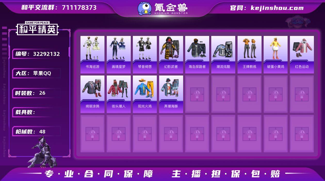 苹果 手Q-0粉装-2特效枪-0载具-1粉色飞行器-11623热力值-1王牌印记-26套装-48枪皮 【粉色枪皮等级】:UMP45-萌骑冒险(三级),Mk14-福马献瑞(五级) 【粉色枪皮】:UMP45-萌骑冒险,Mk14-福马献瑞 【粉色飞行器】:炫彩糖果飞行器 【粉色降落伞】:极意拳锋降落伞,炫彩糖果降落伞,虎痴许褚降落伞 【稀有套装】:套装-雪国风尚,套装-炫彩糖果,套装-马上来财,套装-书海巡游,套装-画境星梦,套装-琴音绮想,角色-碧青流霞,套装-雨过天青,套装-红釉青花,角色-孙斩天 【稀有枪皮】:AUG-冰晶雪宝,AKM-星之彼岸,AKM-破晓战魂,SCAR-L-夜灯,M416-蓝色火焰,蜜獾-虎痴许褚,ACE32-画境星梦,UZI-幻影战神,UMP45-夜灯,汤姆逊-像素花束,MP5K-画境星梦,VSS-虎痴许褚,M1加兰德-画境星梦,S12K-夜灯,S12K-极意拳锋,AA12-G-画境星梦,M249-星之彼岸,MG3-幻世战舞者,突击盾牌-虎痴许褚,平底锅-画境星梦 【其他套装】:套装-幻影武者,套装-海岛探路者,套装-潮流炫酷,套装-王牌教练,套装-破蛋小黄鸡,套装-红色运动,套装-绮丽涂鸦,套装-街头潮人,套装-阳光火鸡,套装-弄潮海豚 【稀有背包】:幻影战神背包(2级) 【营地ID】:1037102650