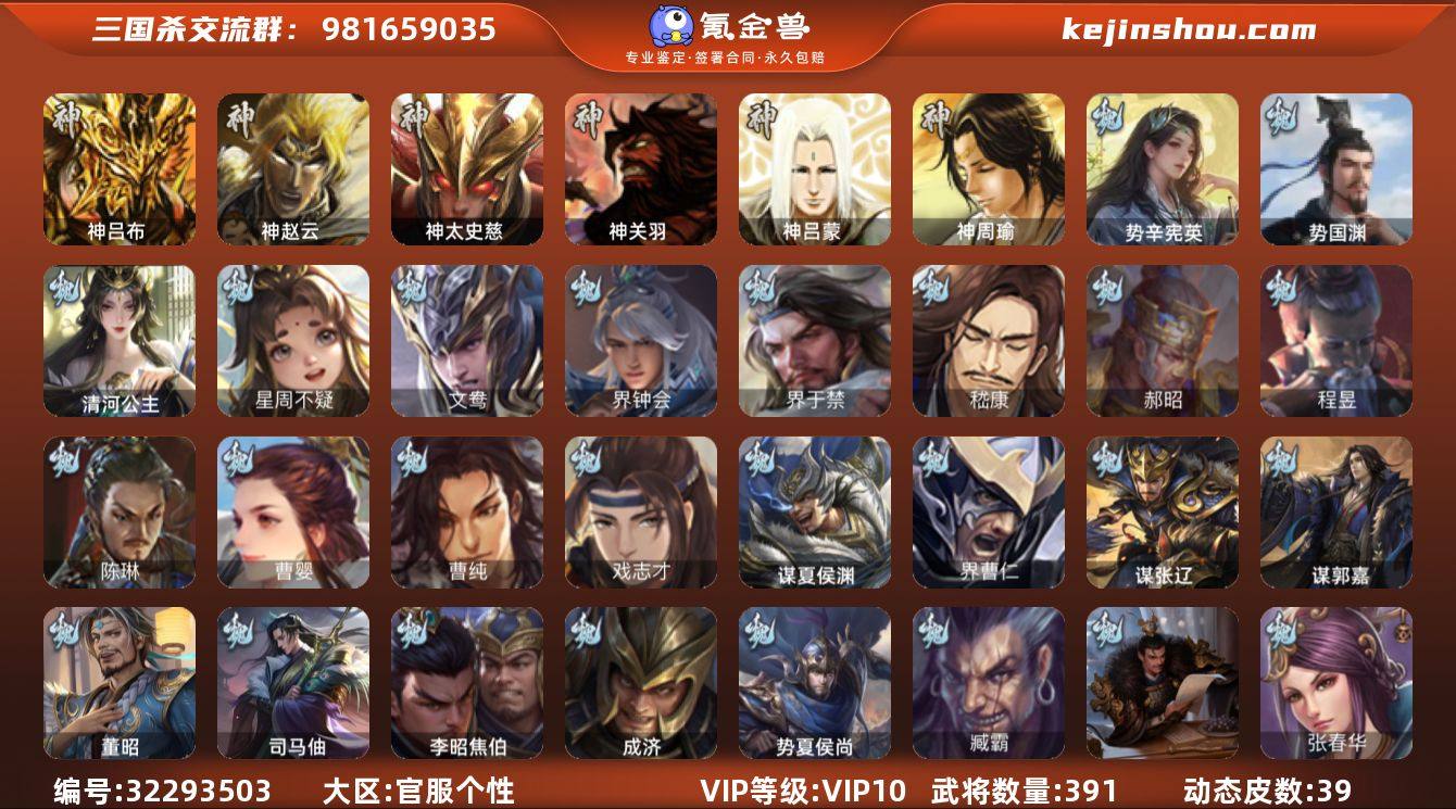 【14789541】官阶:大将军;VIP等级:VIP10;史诗武将数量:41;动态皮肤数量:39;武将总数:391;史诗宝珠数量:20;将魂数量:3855;神将:3;魏国史诗武将:18;蜀国史诗武将:7;吴国史诗武将:7;群史诗武将:13
