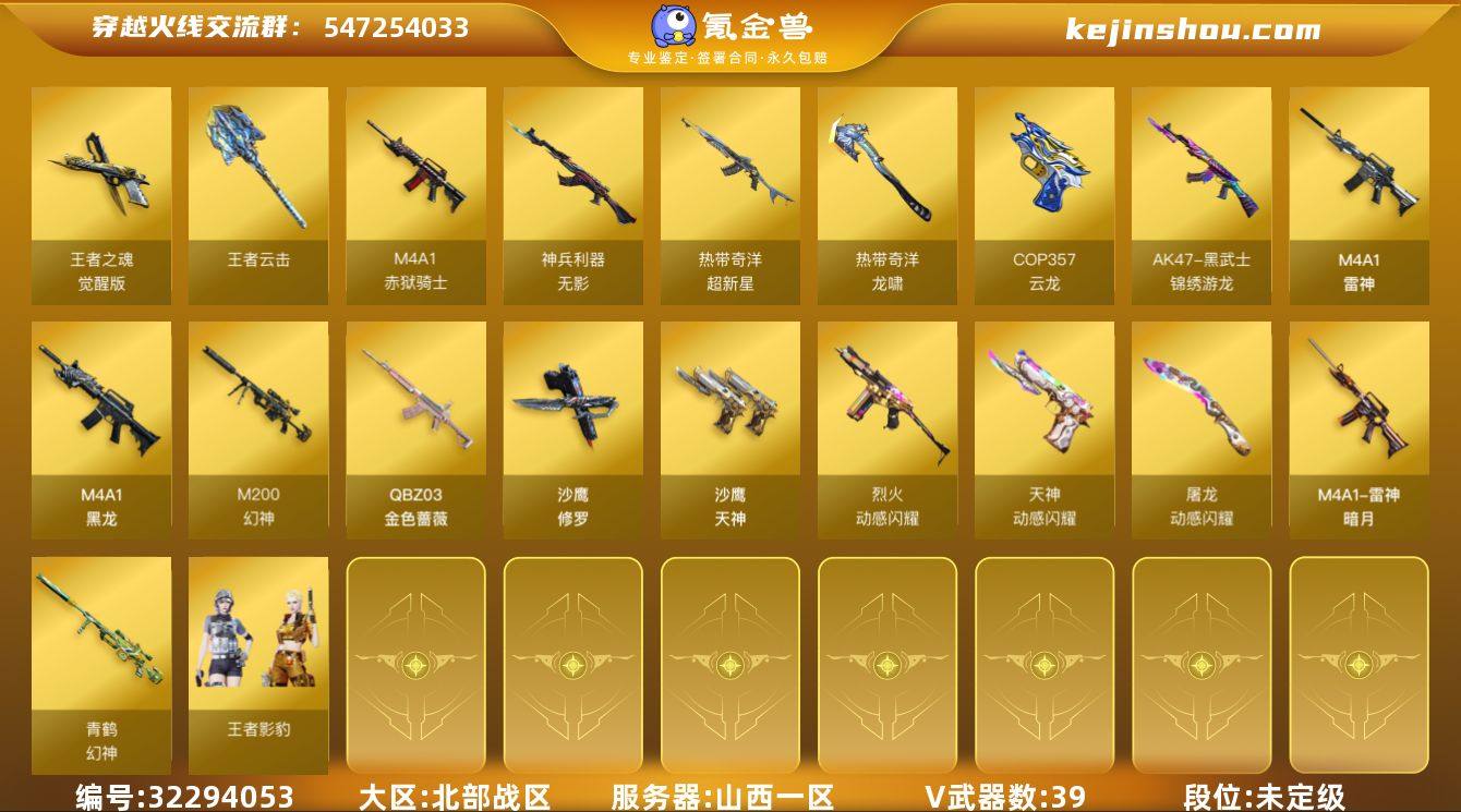 山西一区-39V-3王者-1炫金 【传说角色】:传说星骇 【热门武器】:QBZ03-金色蔷薇,M200-幻神,雷神-小红,沙鹰-修罗 【王者炫金武器】:王者云击,炫金武士 【音效卡】:M4A1-赤狱骑士-怀旧音效卡,Barrett-碧霄极光音效卡 【皮肤】:幻神-青鹤,雷神-暗月 【角色】:王者影豹,雪域霜狐,奇洋探员,乔伊教练,嘉年华灵狐,荆棘玫瑰,灵狐-花神,曼陀罗-礼服,斯沃特-X,游珑儿 【人偶武器】:雷神-小红,AWM-灵狐-15周年嘉年华 【挑战大师】:冰龙粉碎者-白马银枪,激光毁灭者III-白马银枪,神圣爆裂者-末日III 【英雄级武器】:M4A1-黑龙,M4A1-雷神,无影-神兵利器,黑武士-锦绣游龙,超新星-热带奇洋,SCAR Light-玄豹,QBZ03-金色蔷薇,烈火-动感闪耀,M200-幻神,王者凰鸣-觉醒版,沙鹰-修罗,沙鹰-天神,COP 357-云龙*2,USP-冥王,王者之魂-觉醒版,天神-动感闪耀,屠龙-动感闪耀*2,龙啸-热带奇洋,高爆手雷-幻灵*6,手雷-动感闪耀,手雷-热带奇洋,闪光弹-幻灵*7,烟雾弹-幻灵*7,M4A1-赤狱骑士 【道具】:奇洋探员-海龟背包,女皇终结者-背包,热带奇洋炫彩背包,雪域霜狐炫彩背包,女皇终结者-魔龙之吻,救世主-黑桃战神,生化弹匣,夺命之镰,防化服,金色流光-...