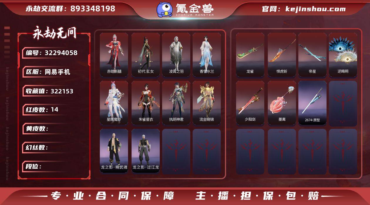 YJJ1897/4.11换绑/等级457/s19三人白银1/19红439金收藏值322153/赤皓新囍/初代玄女/墨离/星辉魔纱/朱雀星衣/新倩女幽魂·长天藏锦/戎金狼//熛怒炼火/凌霄之羽/香雪水兰/执明神君/流金晓锦/少阳剑/帝星/龙雀/悍虎斩/逆晦朔/狂龙//凤求凰/2674·原型/神乌造像/观山海·春木/龙之影·精武魂/龙之道·至纯/剪纸·彩刀/龙之影·过江龙/雪霜姿/幻丝1807/已绑定手游/