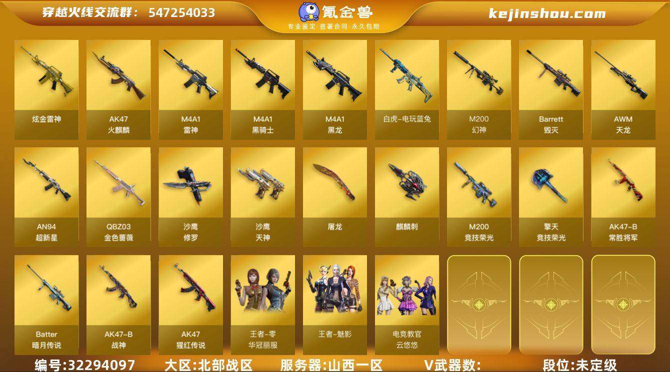 5666/北部/山西一区/可排位/【传奇4】/【Lv.100 大元帅】/VIP6/48V/幻神/幻神降龙/幻神CFS2022/M200竞技荣光/QBZ金色蔷薇/白虎电玩蓝兔/柯尔特冠军之特/【音效卡】/【无星神】/星神音效卡/黑龙音效卡/【枪皮】/毁灭冠军之怒/火麒麟平天大圣/雷神宠儿/雷神宇航兔/黑骑士冠军之势/【四防角色】/电竞教官云悠悠/【角色】/魅影/鹰/王者零华冠丽服/龙儿小淘气/娜塔莉娅/云海玲珑/流浪蔷薇/【小人枪】/天龙曼陀罗/Barrett曼陀罗/【道具】/永久烟雾头/护目镜/超级背包/各种戒指/各种光效/各种玩偶/永久AC/永久雷包/细节看图/【此账号封过十年已解】