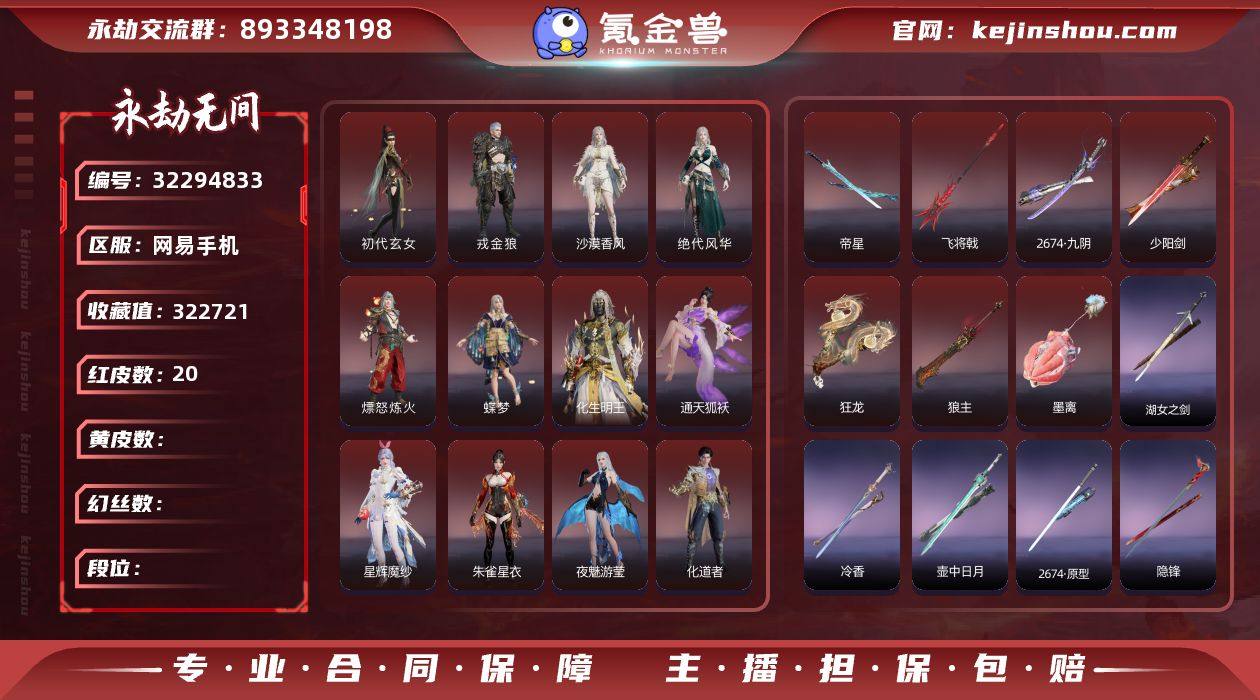 YJJ1898/365换绑/等级422/s19三人黄金3//20红439金322721收藏值/初代玄女/星辉魔纱/朱雀星衣/化生明王/戎金狼/熛怒炼火/蝶梦/绝代风华/沙漠香风/夜魅游莹/通天狐袄/化道者/流金晓锦/少阳剑/2674九阴/帝星/狼主/飞将戟/狂龙/墨离/【技能奥义】/神君印/荆魂/珥冰 宁红夜:/初代玄女/夜华朝/紫金玉女/耀世魂花/午后瑰夏/玄豹姿/九阴圣女/簪缨发 沈妙:/星辉魔纱/朱雀星衣/云溪仙子/絮云衣/奥村春NOIR/千丝发/百灵发/NOIR发型 天海:/化生明王/少林/若水尊者/八宝龙王/双马尾男 殷紫萍:/萍之缘/沐昭/流纨裙/子菀发/伏苓发 特木尔:/戎金狼/唐三/红蓝狂想/噬月天狼/银狼裘/海神发/双马尾男 季沧海:/熛怒炼火/不良人李星云/杰洛特/龙心炽焰/街头烈火/瑞火麟/孽炎祸斗/立天地/游四海/江海发/熛怒发/白狼发/不如吾发/双马尾男 胡桃:/蝶梦/辉烨少女/清雅少女/月丹发/木棉发/月下香发 妖刀姬:/赤影妖刀姬 崔三娘:/文鳐/阿娜希塔/赤雾烟霞/镇海龙/探海裙/伏波龙女/安澜发/碎浪发 岳山:/尼尔/金戈止/戍关将/杨戬/撼山岳/常胜袍/弘毅袍/过江龙/万仞山发/觅封侯发/双马尾男 无尘:/司天命/柳生/灵鹿巫者/幽篁山鬼/羽客发/竹律发/双马尾男 顾清寒:/寒烟素/金襦玉衫 武田信中:/祸津素盏/麟鹿大铠/烈...