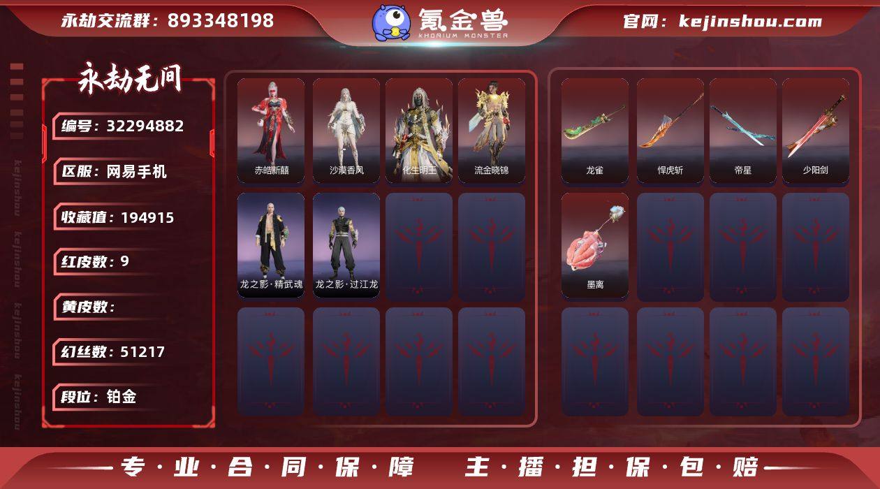 WJ5305,网易手机,可换绑,三人段位铂金3,9红,270金,声望2,神君印,墨离,少阳剑,帝星,龙雀,悍虎斩,赤皓新囍,化生明王,沙漠香风,流金晓锦,精武魂,过江龙,无相印,亢龙,残阳,青石猊,光影裁决,炽羽,鹧鸪天,信手斩龙,春桃笑,金戈止,禄运玉霄,玉叶景,哪吒,天虹咏,木棉,活动中心手机绑定无法解绑,