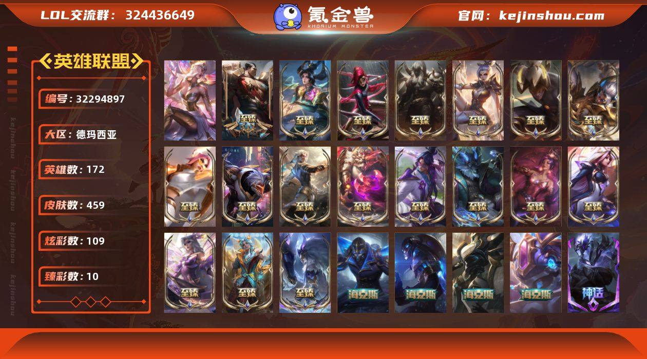 实名: 不可修改 英雄数: 171 皮肤数: 506 至臻: 至臻 烈焰美人 薇恩,至臻 战斗学院 拉克丝,至臻 K/DA 卡莎,至臻 福牛守护者 菲奥娜,至臻 幻灵战斗猫 金克丝,至臻 魂蔷薇 烈娜塔,水晶圣骑 艾希,至臻 K/DA 卡莎(2022),至臻 烈焰美人 薇恩(2022) 情人节限定: 水晶玫瑰 婕拉,水晶玫瑰 斯维因,甜心宝贝 娑娜,幽梦玫瑰 泰隆,幽梦玫瑰 辛德拉,怦然心动 凯特琳 冠军限定系列: S1FNC 迦娜,S1FNC 嘉文四世,S1FNC 卡尔萨斯,S2 暗杀星 蒙多,S2 暗杀星 努努,S3 SKT T1 李青,S3 SKT T1 婕拉,S4 SSW 图奇,S5 SKT T1 阿兹尔,S6 SKT T1 艾克,S7 SSG 塔利垭 冰雪节限定: 阿木木:“主人不要我了”,冰雪节 玛尔扎哈,冰雪节 辛吉德,冰雪女神 辛德拉,冬季仙境 发条,冬境仙灵 索拉卡,平安夜女神 娑娜,魄罗骑士 瑟庄妮,圣诞老人 古拉加斯,圣诞糖果棒 厄运小姐,圣诞玩偶 波比,圣诞驯鹿 克格莫,喜庆之树 茂凯,邪恶圣诞老人 维迦,雪球也能爆炸!吉格斯,雪默丁格,英勇玩具兵 普朗克 泳池派对: 泳池派对 菲奥娜,泳池派对 凯特琳,泳池派对 李青,泳池派对 塔里克,泳池派对 吉格斯 万圣节限定: 鬼影森森 茂凯,伯爵 卡萨丁,鬼影重重 魔腾,灵魂收割者 索拉卡,魅惑女巫 莫甘娜,魅惑女巫 奈德丽,南瓜头 费德提克,死亡誓约 卡特琳娜 年限: 醒狮 克格莫,神龙之翼 库奇,美猴王 孙悟空,神龙烈焰 金克丝,替父从军 花木兰,春晖神女 拉克丝,碧玉之牙 卡西奥佩娅,金猪烈焰 瑟庄妮,紫金罗刹 莫甘娜,天龙之子 斯莫德,点心宝贝 阿木木 其他限定/神话皮: 防暴天使 凯尔,波比的巧克力工坊,电玩战魂 赫卡里姆,防暴士兵 辛吉德,防暴士兵 格雷福斯,冠军典狱长 锤石,冠军之矛 卡莉丝塔,冠军之血 希瓦娜,冠军之隐 劫,红桃杰克 崔斯特,惊悚派对 阿木木,警用试作体K-9 内瑟斯,蓝色忧郁 崔斯特,野兽猎人 德莱文,野兽猎人 瑟庄妮,征服者 阿利斯塔,奥德赛 吉格斯,十五周年纪念...