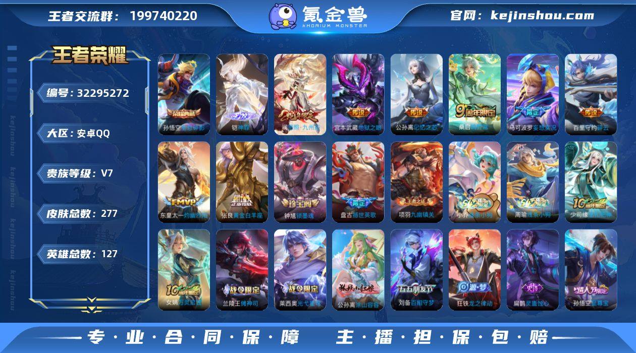 【932418】[17129762]V7 1典藏 1无双 8传说 127英雄 277皮肤 可修改实名 金标至尊宝猴子 【英雄全皮】孙权全皮,蚩奼全皮,戈娅全皮,影全皮,大禹全皮 【稀有英雄】敖隐(小龙人),大司命,韩信(韩跳跳),夏洛特(夏师傅),艾琳,橘右京(橘子),娜可露露(鸟人),不知火舞,赵云,金蝉(唐僧),戈娅 【荣耀水晶】全息碎影(猴子典藏) 【无双皮】神罪 【传说皮】黄金白羊座,地狱之眼,碎云,记忆之芯(机甲兔),灼幽烈阳,妄想实况 【珍宝阁皮】胡桃夹子,蔷薇恋人,玩趣恶龙 【赛季/战令皮】噬灭天穹(s37),古海寻踪(s33),海盐诗旅(s30),擒涛扼浪(s31),潮玩骑兵,奇幻香踪,探海日志(s32),驭风魔法,玲珑珍味,流音漫舞,顽趣-梦奇,地狱燃心,剑破天穹(s35),天穹祈灯(s34),天穹之誓(s36),疑决卦(s19),醍醐杖(s20),原初探秘者(s21),万华元夜(s22),演武夺筹(s23),驱傩正仪(s24),千军破阵(s25),朔望之晖,暗影游猎(游乐娃子),单词大作战,狂想玩偶喵,潮玩骑士王,云间偶戏,星际陆战队-达摩,胡桃异想国,沙漠行僧(s26),金庭之子(s27),大漠名商(s28),云中旅人(s29) 【史诗皮】星界战将,茶境仙,器灵·浮梦炉,蔬乡物语(鲁班七号),化蝶舞,撼世英歌,线条小狗-周瑜,九幽镇关,线条小狗-小乔,巫礼祀神,万灵启世,光弋星穹,涂山容...