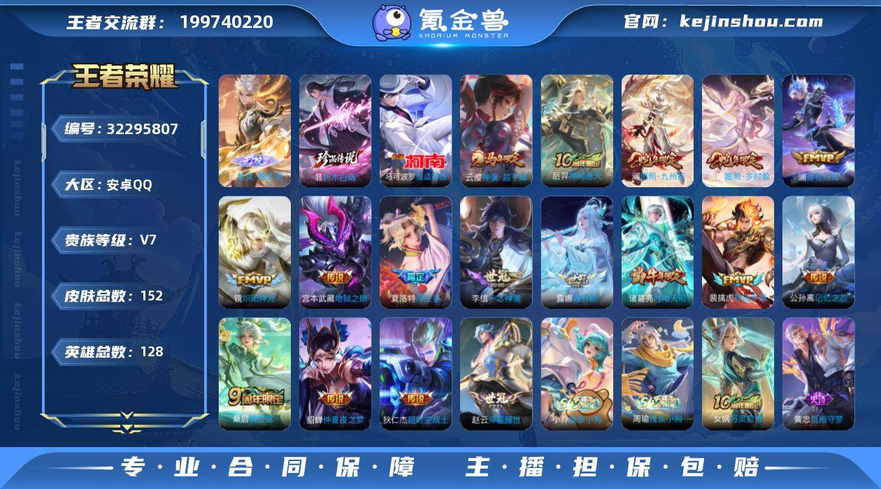 安卓Q-V7-尊贵铂金I段位-128英雄-270皮肤-1典藏皮肤-15传说-64史诗【荣耀典藏】:李白鸣剑曳影【传说皮肤】:澜愿照九州拓,公孙离祈雪灵祝,诸葛亮时雨天司,镜炽阳神光,孙悟空零号赤焰,关羽武圣,曜云鹰飞将,李信一念神魔,貂蝉猫影幻舞,张良黄金白羊座,干将莫邪久胜战神,达摩黄金狮子座,花木兰冠军飞将,李白凤求凰,宫本武藏地狱之眼【限定皮肤】:白起狰,狄仁杰阴阳师,虞姬凯尔特女王,赵云皇家上将,墨子神迹守卫,嬴政优雅恋人,嬴政白昼王子,孙尚香蔷薇恋人,鲁班七号狮舞东方,庄周蜃楼王,高渐离死亡摇滚,阿轲迷踪丽影,钟无艳王者之锤,孙膑妖精王,扁鹊炼金王,芈月重明,吕布猎兽之王,周瑜赤莲之焰,元歌云间偶戏,夏侯惇朔风刀,甄姬游园惊梦,曹操烛龙,典韦穷奇,典韦蓝屏警告,马可波罗暗影游猎,狄仁杰魔术师,狄仁杰万华元夜,达摩星际陆战队,达摩沙漠行僧,项羽海滩派对,老夫子圣诞老人,老夫子醍醐杖,老夫子航海奇遇记,关羽冰锋战神,关羽武圣,程咬金演武夺筹,刘邦夺宝奇兵,韩信逐梦之影,韩信飞衡,兰陵王驯魔猎人,兰陵王金庭之子,亚瑟潮玩骑士王,孙悟空至尊宝,孙悟空零号赤焰,牛魔御旌,李元芳银河之约,李元芳云中旅人,钟馗...