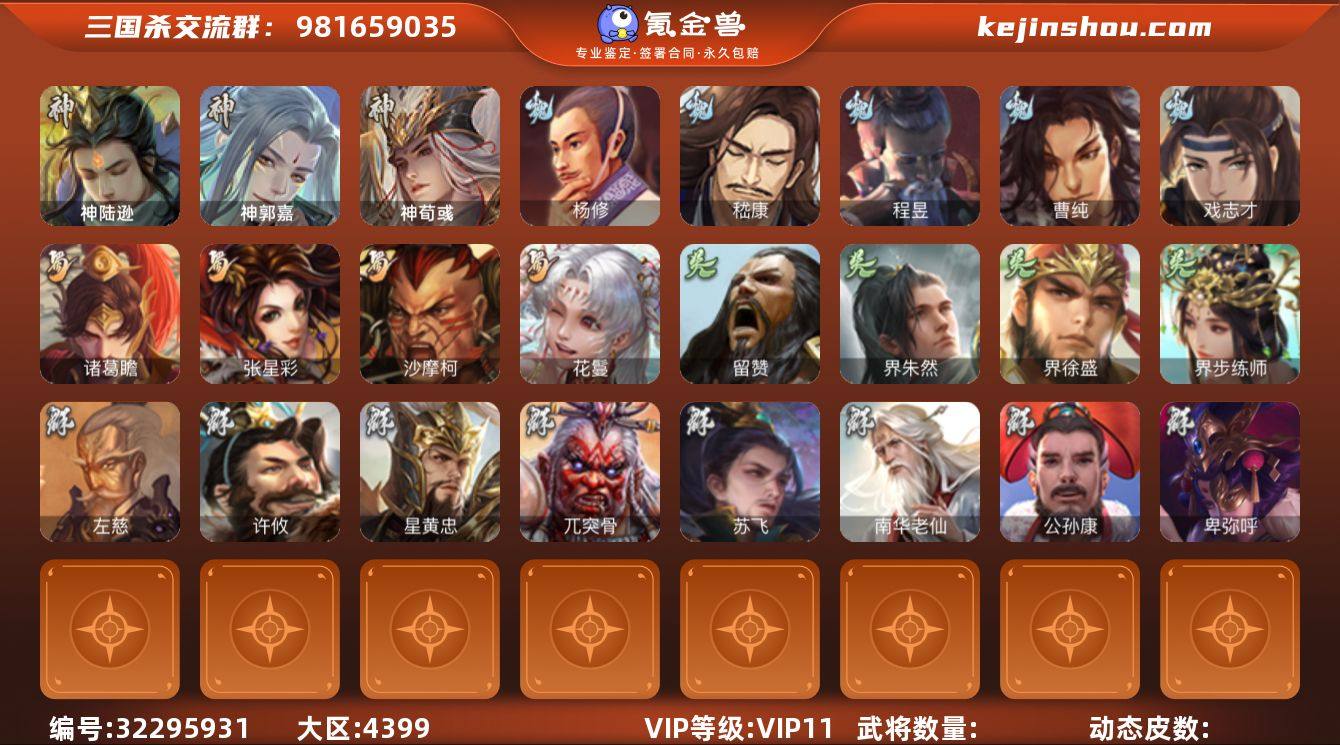 【14789548】渠道12223 三等大将军:至尊神郭嘉,动态神荀彧,南华老仙,界徐盛,动态神陆逊,许攸,诸葛瞻,嵇康,程昱,戏志才,杨修,曹纯,花鬘,张星彩,沙摩柯,界朱然,留赞,卑弥呼,公孙康,兀突骨,左慈,苏飞,星黄忠,界步练师,界朱然等33史诗。排位武将117。包裹:手气卡5400、羽毛1800、心愿积分2000、将魂1500、金票10000。 渠道:4399、安卓手机均可玩,可以换绑,账号包赔包回收,游戏内玩家互通。