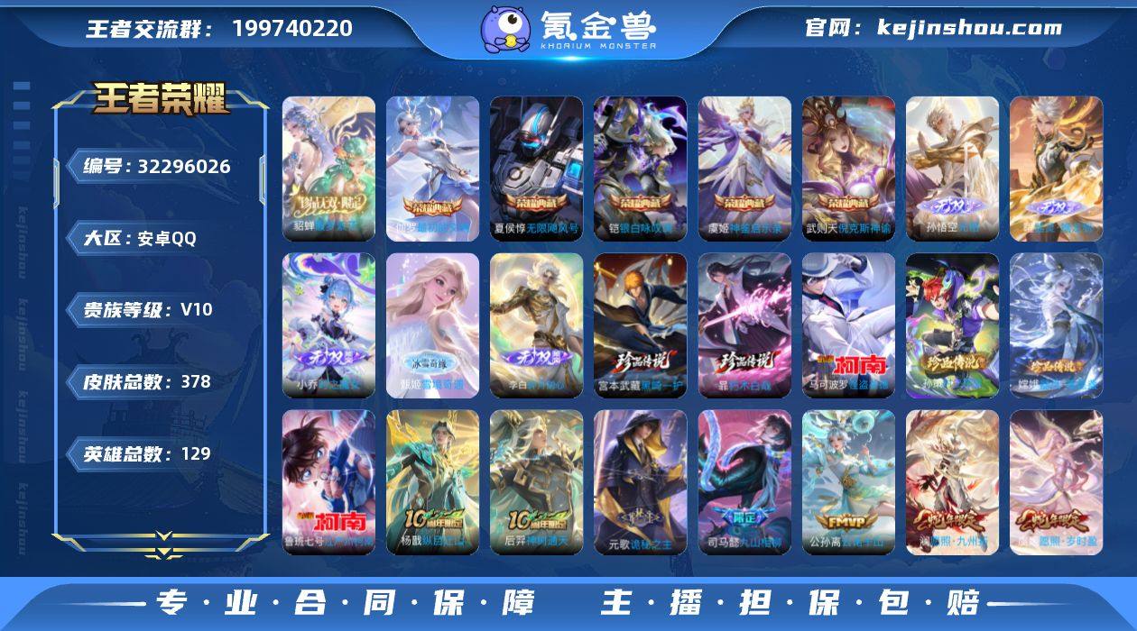 精品女号 精品女号【补33就到V11】 安卓Q-V10-秩序白银II段位-129英雄-378皮肤-5典藏皮肤-1典藏英雄-1珍品无双-5无双-6珍品传说-55传说-132史诗【英雄全皮】:孙权全皮,苍全皮,空空儿全皮,影全皮【荣耀典藏】:武则天英雄,武则天倪克斯神谕,夏侯惇无限飓风号,铠银白咏叹调,虞姬神鉴启示录,伽罗最初的交响【珍品无双】:貂蝉馥梦繁花【无双皮肤】:孙悟空无相,曜器灵螭龙剑,甄姬雪境奇遇,小乔时之魔女,李白碎月剑心【珍品传说】:宫本武藏黑崎一护,暃朽木白哉,嫦娥器灵落星盏,孙策时之奇旅,鲁班七号江户川柯南,马可波罗怪盗基德【传说皮肤】:杨戬纵目迁山,后羿神树通天,元歌诡秘之主,司马懿九山相柳,公孙离云诺千山,杨玉环星之鸣奏,后羿千劫归真,司空震愿照山河定,女娲愿照千秋盛,妲己愿照众生和,澜愿照九州拓,蔡文姬愿照福禄聚,虞姬愿照岁时盈,云缨幻光神枪,嬴政玄雷天君,貂蝉曦玄引,典韦战鼓燎原,孙尚香乘龙问璇玑,赵云乘龙铭钟鼎,艾琳觅芳踪,兰陵王影龙天霄,马可波罗妄想实况,张飞百相守梦,夏洛特浮生妄,花木兰燃星之曲,吕布怒海麟威,李白诗剑行,不知火舞绯月行,百里守约碎云,孙尚香音你闪耀,马超无双飞将,孙尚香异界灵契...