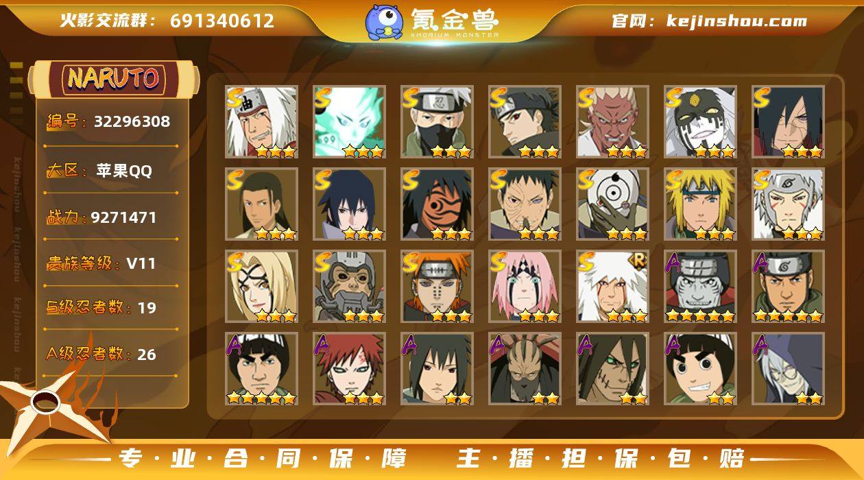 0B7XNO 号,VIP11,战力:9271471,S忍者数量:19,A忍者数量:30,本服排名:345,战区排名:未上榜,通灵兽数量:17,时装数:13,段位:上忍1阶,忍者星数:384