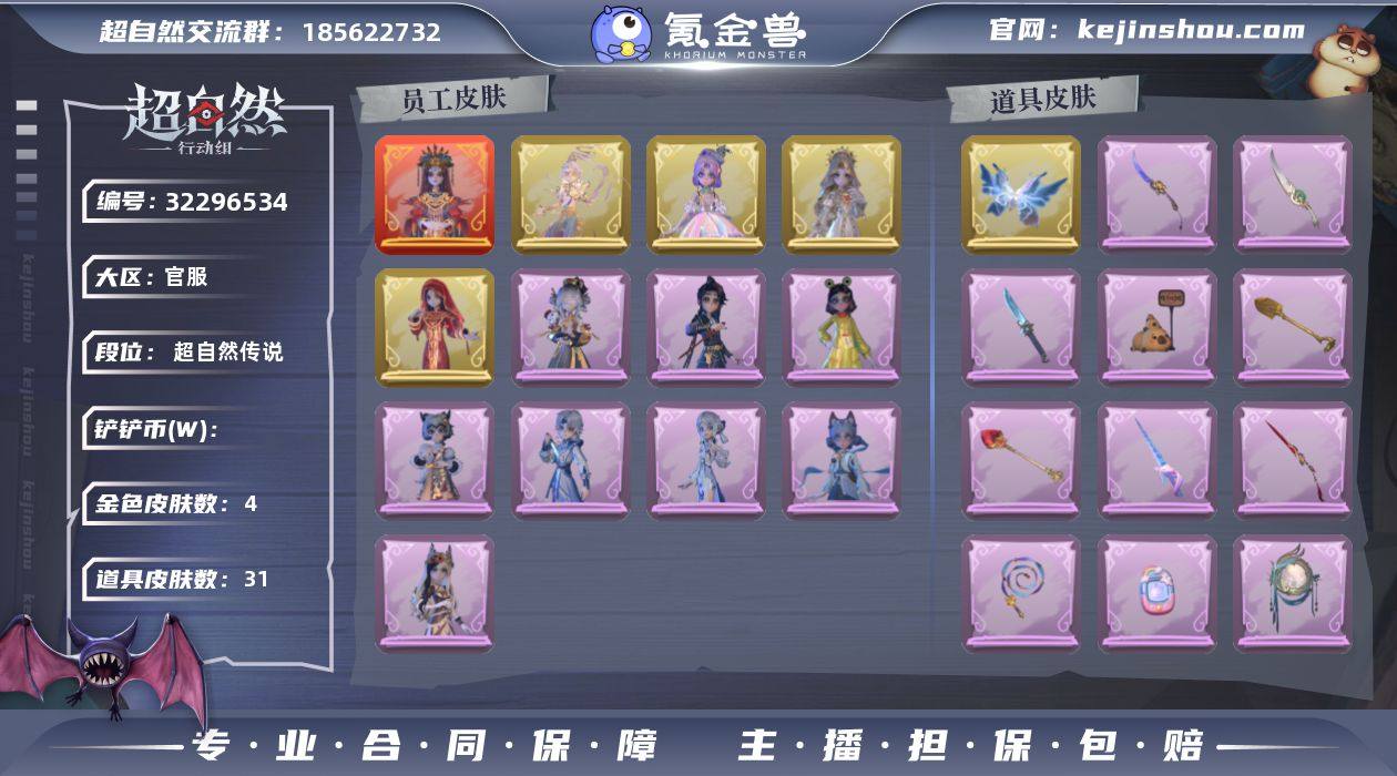 【932056】[16731717]1红皮 4金皮 12紫皮 青瓷,冬夜暖忆,逆时审判,绯色遗证,幻宠之门,云端梦想计划,宝剑八,祝祷词,昆仑镜,小狗蛇点点鞭,青玉抱丹,凤鸣九天,最后的独角兽,圣心之泪,龙鳞,小鲨匕首,伏妖塔,飞花令,珍珠芭乐莓莓,赞萌露比水枪,月下莲台,紫气东来,晶澜灵翼,紫霄,金丝眼镜,飞天绫,鸣沙鼓,卡皮巴拉小黄豚铲,碧络琅环,桃心,happy猫道具 举牌,刀马舞,鸳鸯戏,七仔摇,要糖,Sugar摇,KT猫摇,晚安公主舞,孤身摇,鞭子舞,新年摇,青海摇,抬手,伤心摇,星奇摇,舞台中心,心跳摇,小雨摇,鹏友摇动作 10级梦居 超自然传说 【服装】镜生遗梦,庆宴绮愿,尘封旧事,太空鲨头套,雪墩墩头套,精致露比头套,异色序曲,晚安小熊,烛光纪念,莲华渡,九色祥鹿,罗丽,情公主,白光莹,青丘一梦,素影瑶光,青云逸歌,霓裳踏雪,镜花辞,圣光之谕,遗失的童话,梵音莲华,天使消失的年代,除妖小师妹,绒团小狐狸,绣春逍影,呱呱雨衣,钗头凤,小小玛丽,蝶恋花,天使的呼唤 【道具】青瓷,冬夜暖忆,逆时审判,绯色遗证,幻宠之门,云端梦想计划,宝剑八,祝祷词,昆仑镜,小狗蛇点点鞭,青玉抱丹,凤鸣九天,最后的独角兽,圣心之泪,龙鳞,小鲨匕首,伏妖塔,飞花令,珍珠芭乐莓莓,赞萌露比水枪,月下莲台,紫气东来,晶澜灵翼,紫霄,金丝眼...