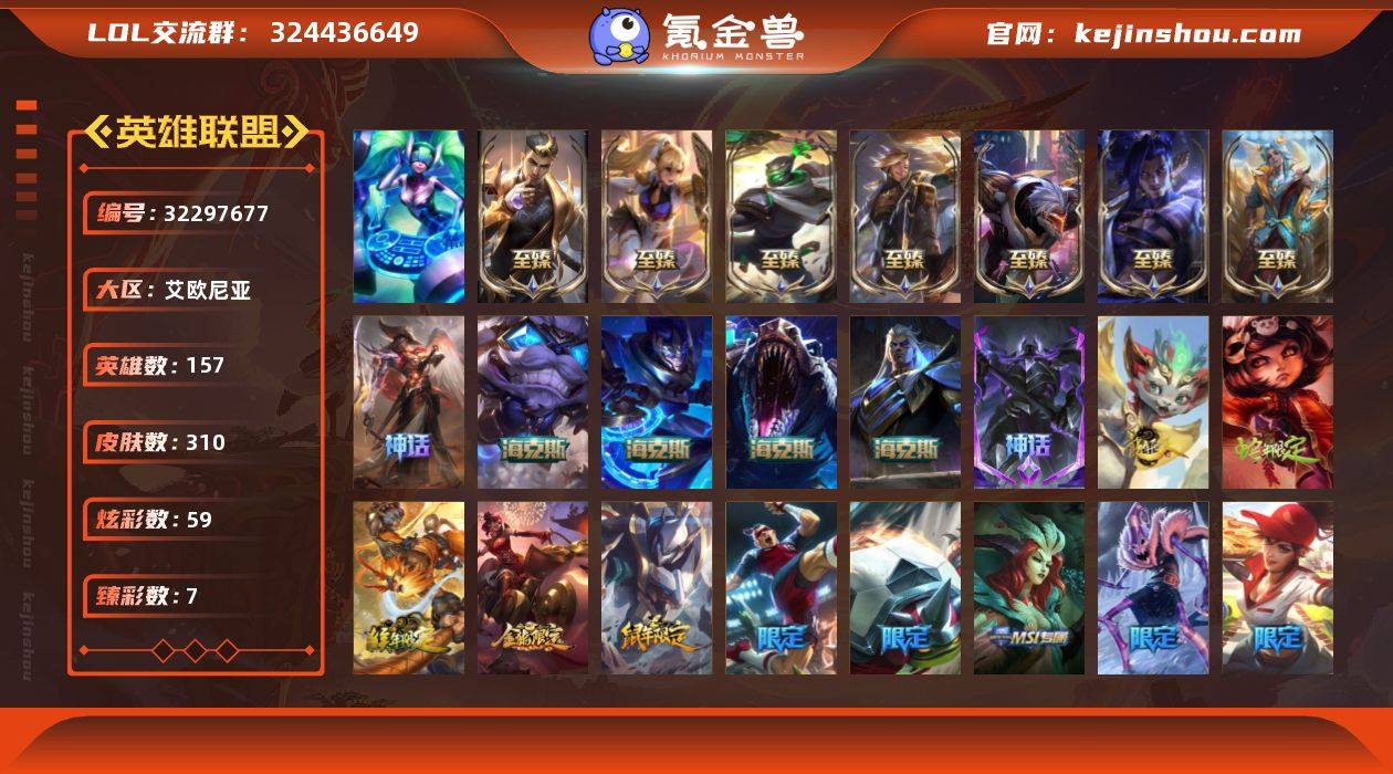 【x29532】:未定级段位-171英雄-170皮肤-29炫彩-0终极-4神话-23限定-21传说-42史诗 【臻彩皮肤】:征服者阿利斯塔炫金,星之守护者霞烈羽,水晶玫瑰迦娜甜蜜花蕾 【年限皮肤】:王国机神白虎贾克斯,天龙之子李青,天龙之子斯莫德 【海克斯皮肤】:海克斯科技卡萨丁 【冰雪限定】:圣诞玩偶波比,冰雪节格雷福斯 【神话皮肤】:十周年纪念安妮,十五周年纪念希维尔,神凰行者瑞羽圣凰艾尼维亚,海克斯科技卡萨丁 【限定皮肤】:SKTT1贾克斯,SKTT1李青,SSW辛吉德,SKTT1阿利斯塔,SKTT1伊莉丝,SKTT1扎克,暗裔英雄盖伦,死亡誓约卡特琳娜,无头骑士赫卡里姆,泳池派对佐伊,暗影沃里克,波比的巧克力工坊,勇者奈德丽,电玩战魂赫卡里姆,都铎王朝图奇,制胜金靴李青,防暴天使凯尔,双城之战2幸存者杰斯 【传说皮肤】:血石领主弗拉基米尔,墨之影武者易,霸天零式赛恩,黑夜使者索拉卡,源计划联合艾希,战地巨兽科加斯,女主播迦娜,最终BOSS维迦,丧尸布兰德,神拳李青,炼狱魔犬内瑟斯,腥红之月鬼武姬阿卡丽,星之守护者阿卡丽,钢铁军团盖伦,神王盖伦,星之守护者拉克丝,焰尾妖狐阿狸,灌篮高手德莱厄斯,黑夜使者亚索,西部魔影卢锡安,天煞劫 【史诗皮肤】:冰霜烈焰安妮,腥红之月崔斯特,屠龙勇士赵信,铁钩船长费德提克,重生之沙费德提克,地狱火阿利斯塔,钢铁之心希维尔,熊猫提莫,女船长厄运小姐,全金属狂潮拉莫斯,战争血统蒙多,夜行义贼艾瑞莉娅,北领前线斯维因,抵抗军天使凯特琳,铁血狙击手凯特琳,沙漠风暴卡特琳娜,符文战神雷克顿,枯萎之壤雷克顿,暗星嘉文四世,灵魂烈焰布兰德,至高之拳李青,生化博士黑默丁格,法老王朝内瑟斯,血色之锤波比,钢铁意志潘森,死亡领主莫德凯撒,刺客信条锐雯,海牛猎手菲兹,铁血猎人雷恩加尔,白色死神韦鲁斯,永恒之森赫卡里姆,沙之守护...