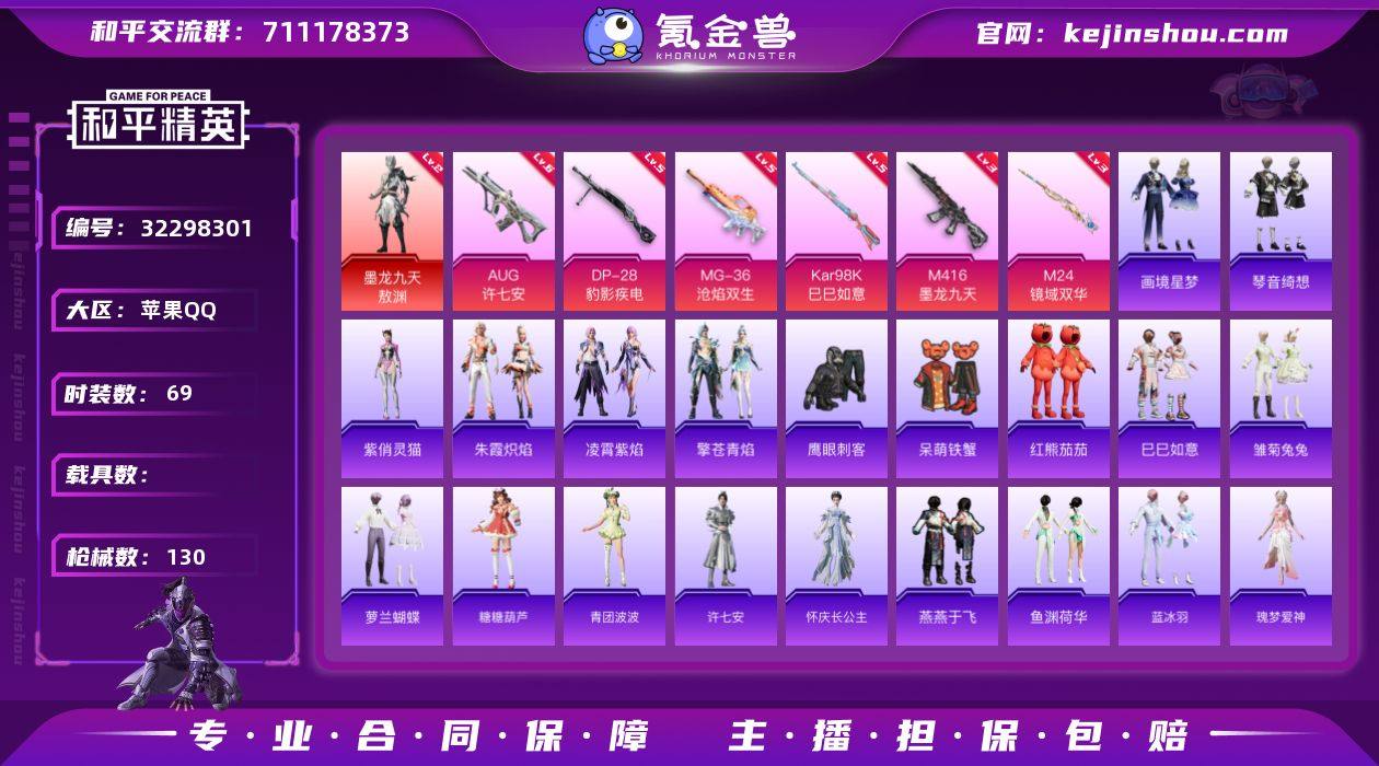 不可二次 苹果 手Q-1神装-0粉装-8特效枪-0载具-6粉色飞行器-36782热力值-5王牌印记-69套装-130枪皮 QW262417 【红色神装等级】:墨龙九天-敖渊(二级) 【红色角色神装】:墨龙九天-敖渊 【热门品类】:套装-红熊茄茄 【粉色枪皮等级】:M416-墨龙九天(三级),AUG-许七安(六级),ACE32-萌骑漫游(三级),Kar98K-巳巳如意(五级),M24-镜域双华(三级),Mk14-福马献瑞(一级),DP-28-豹影疾电(五级),MG-36-沧焰双生(五级) 【粉色枪皮】:M416-墨龙九天,AUG-许七安,ACE32-萌骑漫游,Kar98K-巳巳如意,M24-镜域双华,Mk14-福马献瑞,DP-28-豹影疾电,MG-36-沧焰双生 【粉色飞行器】:炫彩糖果飞行器,祥瑞起舞飞行器,沙丘之主天马,镜域双华-灵镜之阶,龙翔九天飞行器,墨金战记飞行器 【粉色降落伞】:墨龙九天降落伞,临安公主降落伞,鬼刀降落伞,樱桃泡泡降落伞,魔童闹海 哪吒降落伞,异瞳寒姬降落伞,炫彩糖果降落伞 【稀有套装】:套装-巳巳如意,套装-雪国风尚,套装-炫彩糖果,套装-马上来财,套装-雏菊兔兔,套装-萝兰蝴蝶,套装-糖糖葫芦,套装-青团波波,角色-许七安,角色-怀庆长公主,套装-燕燕于飞,套装-鱼渊荷华,套装-蓝冰羽,角色-瑰梦爱神,套装-朱霞炽焰,套...
