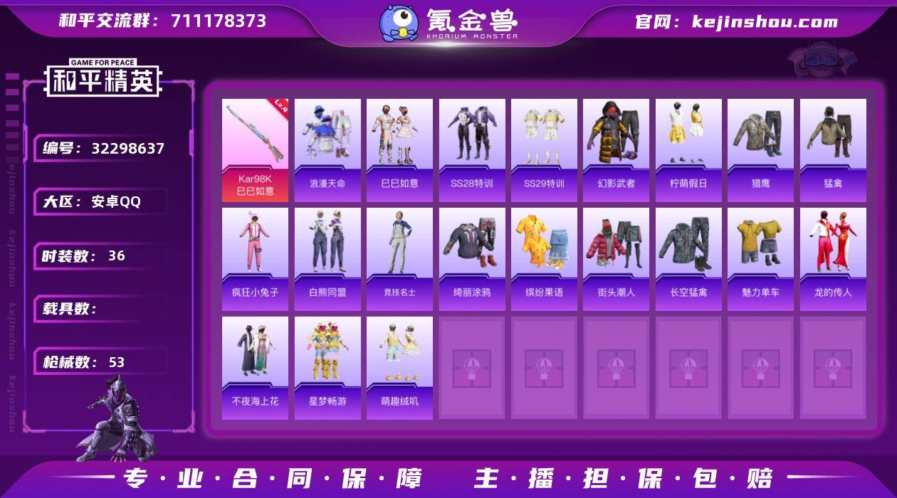 【HPN2033】36套装/枪械4/装备56/战备41/王牌印记3/热力值15030/四级AKS-74U-森灵之息/四级Kar98K-巳巳如意/五级Mk14-福马献瑞/五级AA12-G-萌骑幻想/浪漫天命/AKS-74U-森灵之息/Kar98K-巳巳如意/Mk14-福马献瑞/AA12-G-萌骑幻想/星之彼岸降落伞/蜜语绒猫降落伞/巳巳如意/套装-马上来财/套装-雨过天青/套装-红釉青花/角色-暖阳柴柴/AKM-彩虹符号/AKM-星之彼岸/AKM-龙的传人/SCAR-L-炫彩节奏/M416-糯团青竹/AUG-耀粉歌者/M762-天降萌叽/M762-彩虹符号/蜜獾-天降萌叽/UZI-天降萌叽/Vector-彩虹符号/汤姆逊-像素花束/P90-巳巳如意/M24-奇异狩猎者/SKS-炫彩节奏/VSS-星之彼岸/S686-巳巳如意/M249-星之彼岸/MG3-幻世战舞者/PKM-蜜语绒猫/破片手榴弹-巳巳如意/SS28特训/SS29特训/幻影武者/柠萌假日/猎鹰/猛禽/疯狂小兔子/白熊同盟/竞技名士/绮丽涂鸦/缤纷果语/街头潮人/长空猛禽/魅力单车/龙的传人/不夜海上花/星梦畅游/萌趣绒叽
