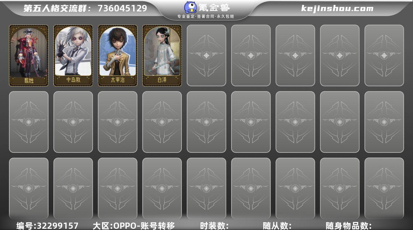 杰克-翦烛,佣兵-中岛敦,“囚徒”-太宰治,古董商-白泽 卖家说:白泽太宰治中岛敦真像小姐超级欧号 监管这些都是30发内白piao的 白泽太宰中岛真相的配置我买的时候1.2k唉 秒香了所以这个价格很合适了转移号不用担心找回 号里还有回声 其他的皮肤当送的了 古早号有很多美皮 归宿装修的挺可爱的