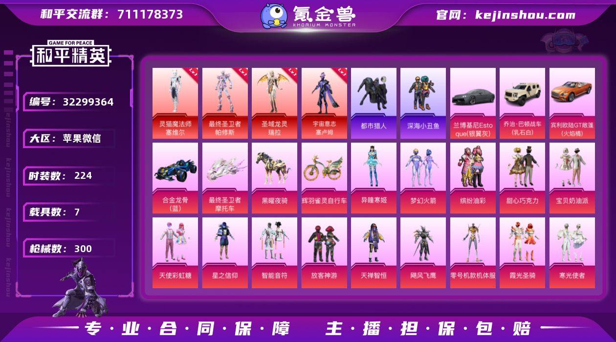 实名:可二次实名 是否支持人脸包赔:支持 粉装数量:38 特效枪数量:30 载具数:8 时装数:1362 枪械数:541 奇异狩猎者,都市猎人,派对舞王,深海小丑鱼 三级沙丘之主-图卡盟 小舞·雪昙,花中眠,极意拳锋,异瞳寒姬,羊梦糖心,阿尔茜,暗夜鎏金,宝贝奶油派,冰川红玫,缤纷油彩,彩虹甜喵,垂柳戏鸭,纯珍童话,第五大道,蝶舞迷情,古堡领主,幻彩电音,幻情紫藤,橘柚倾心,恐龙拽拽,冷漠罗丽,蓝莓炮弹,洛天依,莲影清波,梦幻火箭,蜜语绒猫,千金淑猫,沙场疾风,室女星神,射星猎手,双星鱼跃,天鹅座 冰河,桃粉嫣然,太空嘟嘟,绚金战神,星穹咏叹调,新星烈龙,荧海星豚 七级M249-蓝莓炮弹,七级M416-心之恋语,五级DP-28-豹影疾电,五级AKM-绿萝繁花,五级AKM-炫紫旋律,五级AUG-星之彼岸,五级AWM-橘柚倾心,五级GROZA-镜光银凌,五级Kar98K-巳巳如意,五级M416-电玩时刻,五级SCAR-L-锦绣绵绵,四级AKS-74U-森灵之息,四级蜜獾-异瞳寒姬,四级AKS-74U-星穹咏叹调,四级DP-28-千金淑猫,四级M16A4-垂柳戏鸭,三级AKM-暮色玫影,三级平底锅-喜羊羊与灰太狼,三级GROZA-精灵之光,三级M24-镜域双华,三级M416-墨龙九天,三级MG-36-幻彩电音,三级P90-金丰海韵,三级Vector-最终圣卫者,二级SCAR-L-灵驹仙姬,二级UMP45-萌骑冒险,二级信号枪-金乌曜日,一级M417-第五大道,一级P90-沙丘之主,一级平底锅-桃粉嫣然 保时捷918Spyder(液态银),鬼马风驰,黑曜夜骑,疾风龙骑,兰博基尼URUS(明艳黄),灵翼风驰(幻彩蓝),特斯拉Model 3(冷光银),最终圣卫者摩托车 狙击之神,马上来财,福马献瑞,霜纹水星,红釉青花,SS37特训,雨过天青,玲珑侠影,青翼流星,阳光菠萝,雪国风尚,画境星梦,琴音绮想,书海巡游,SS36特训,奇异狩猎者,炫彩糖果,绯色魅影,萌鸡速递,紫俏灵猫,风迹短诗,秘语星愿,SS35特训,午间小调,元气之梦,漫游都市,懒羊羊,美羊羊,喜羊羊,薄荷星砂,云魄琉璃,狂鲨锋刃,凌霄紫焰,擎苍青焰,SS34特训套装,游乐,朱霞炽焰,8号机,暗夜契约,冰川格斗者,冰川谧蓝,冰川特警,冰冻风暴,缤纷假日,暴风机械师,北国孤狼,滨海厨神,滨海假日,白辉玉蕊,冰河战士,壁垒格斗者,爆裂葡萄,冰爽风暴,白色伏地魔,贝斯之夜,白熊同盟,白月香洋装,本愿之火,纯白誓言,春光漫游,彩虹兔,雏菊兔兔,长空猛禽,丛林猎人,潮流先锋,潮流炫酷,潮流游乐家,超能勇士,传奇侦探,春日漫步,晨曦薄雾,纯真浪花,东方飞龙,顶瓜瓜,大橘大利,大橘为重,呆萌铁蟹,登山爱好者,都市丽猫,都市猎人,都市魅力,淡雅花蕊,风暴特警,翡翠奔狼,飞驰魅影,绯格组合,风华少年志,粉红小猪,粉恋花,粉日山川,粉团憨憨,风行保卫者,福星高照,格斗先锋,瑰梦爱神,龟仙人,光之冒险,幻彩翩翩,海岛探路者,鹤鸣,红酒骑士,湖蓝色名流,荷鲁斯之眼,海龙战士,湖畔霞光,荷畔雨呱,海琴烟,黑色刀锋,黑色伏地魔,黄色伏地魔,黄色名流,海上生明月,黄色运动,红色运动,幻世战舞者,浑天鲲鹏,和煦暖阳,湖雨初晴,幻羽潜行,幻影武者,海洋之心,极地朋克,鲛海歌灵,酒红色名流,惊鸿侠骨,橘黑制服,娇憨猪猪,竞技达人朋克,竞技名士,竞技勇士朋克,吉莉礼服,极速光影,极速红龙,极速竞梦,精神漫游,街头潮人,街头风暴,机械英豪,机械征服者,锦衣飞扬,金耀舞者,绛羽幽主,酷潮明星,空岛之星,快乐星愿,快闪甜心,空投萌叽,蓝冰羽,