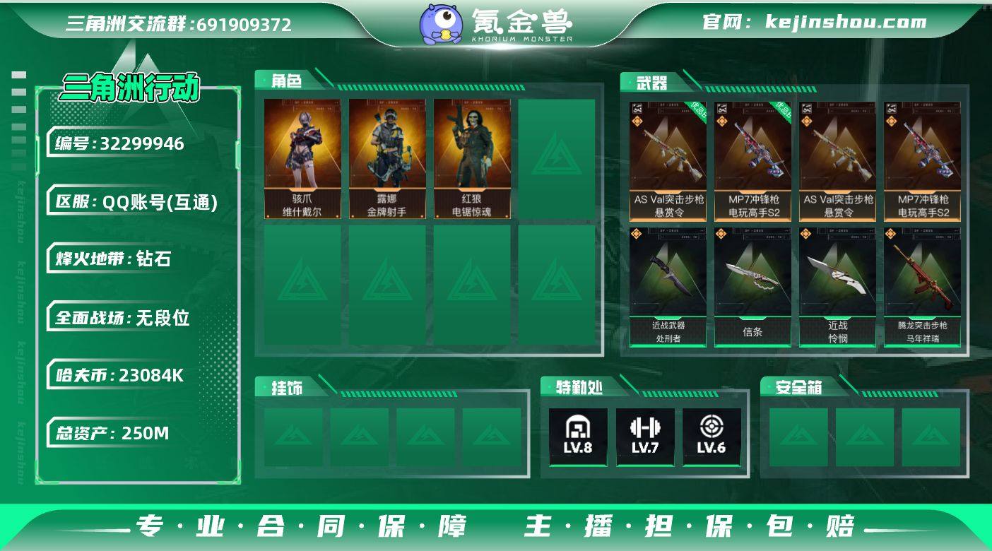 【SJZD2445】总资产(M):250M/哈夫币(K):23084K/哈夫币(K):23084K/传说枪皮数:23/全面战场等级:1_段位:无段位/烽火地带等级:60_段位:钻石/骇爪-维什戴尔/红狼-电锯惊魂/露娜-金牌射手(S7)/近战-信条/近战-怜悯/近战-处刑者/近战-黑鹰/AS Val突击步枪-悬赏令/MP7冲锋枪-电玩高手S2/优品B典藏武器外观-AS Val突击步枪-悬赏令/优品B典藏武器外观-MP7冲锋枪-电玩高手S2/M4A1突击步枪-阿米娅/AKM突击步枪-锦绣/K416突击步枪-行动记录/SG552突击步枪-运动员/SCAR-H战斗步枪-启航/CAR-15突击步枪-阿米娅/腾龙突击步枪-马年祥瑞/腾龙突击步枪-万金泪冠/K437突击步枪-锦绣/KC17突击步枪-电锯惊魂/SMG-45冲锋枪-锦绣/勇士冲锋枪-万金泪冠/M250通用机枪-骑士之心/M14射手步枪-蛮荒/M14射手步枪-缄花/SKS射手步枪-骑士/SR-25射手步枪-缄花/R93狙击步枪-维什戴尔/AWM狙击步枪-万金泪冠/.357左轮-缄花/G18-马年祥瑞/AKM突击步枪-逆战未来/QBZ95-1突击步枪-曙光/ASh-12战斗步枪-无极限/K416突击步枪-冬日风情/K416突击步枪-腊梅/K416突击步枪-阿萨拉特攻/AUG突击步枪-蝮蛇/M7战斗步枪-百步穿杨/SCAR-H战斗步枪-囚徒/G3战斗步枪-流沙送葬/AS Val突击步枪-百步穿杨/腾龙突击步枪-猎鳄行...